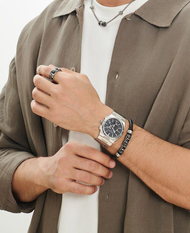 Мужские кварцевые часы-хронографХронографФункция позволяет измерять отрезки времени с особой точностью: часы, минуты, секунды. Верным признаком хронографа является наличие на циферблате 3 дополнительных окошек-счётчиков. Mathey-Tissot Zoltan H117CHAN — это стильное сочетание элегантности и современного дизайна. Изящный корпус выполнен из нержавеющей стали, диаметром 42 мм, что придаст образу элегантности и надежности. Изысканный циферблат с метками в виде штрихов придает модели особый блеск. Циферблат защищен сапфировым стекломСапфировое стеклоПрочный и надёжный материал из кристалла сапфира синтетического происхождения, характеризующийся особой твёрдостью и устойчивостью к царапинам и повреждениям., обеспечивающий устойчивость к царапинам. Стрелки и метки с люминесцентным покрытиемЛюминесцентное покрытиеПозволяет считывать показания времени в темноте. Производители наносят на стрелки, часовые индексы, безель или поверхность циферблата светонакопительный состав, дающий холодное свечение.. Окошко даты находится в положении 4 часа. Часы оснащены надежным кварцевым механизмом. Стальной браслет на застёжке-бабочке с кнопкамиЗастёжка "бабочка"Такой вид застёжки дополняется предохранителями, помогающими избежать случайного раскрытия браслета. Обладают изящным исполнением. , гарантирует комфортное и безопасное ношение. Класс водозащиты: 50 метров позволит защитить корпус от случайных брызг или капель дождя. Mathey-Tissot  — отличный выбор для тех, кто ценит утонченность и качество.