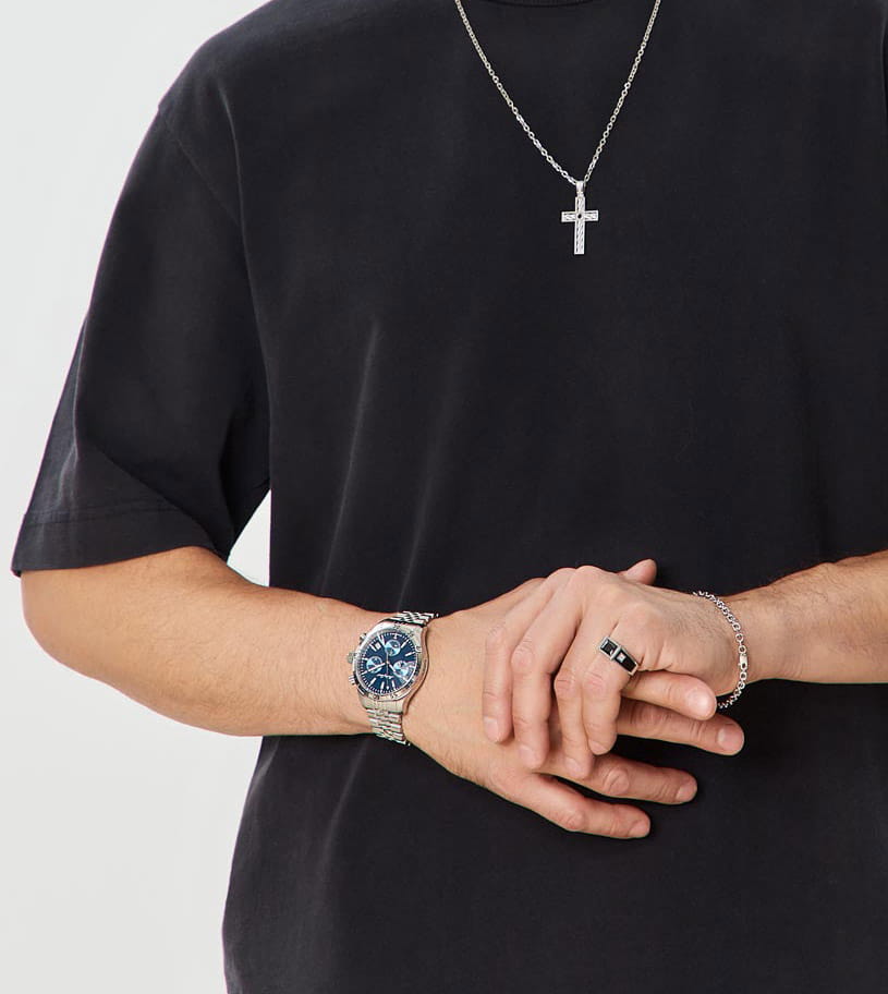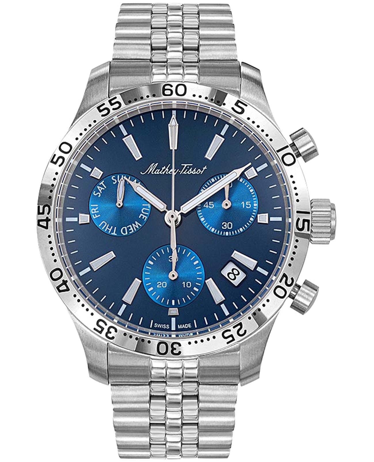 Мужские кварцевые часы-хронографХронографФункция позволяет измерять отрезки времени с особой точностью: часы, минуты, секунды. Верным признаком хронографа является наличие на циферблате 3 дополнительных окошек-счётчиков. с секундомеромСекундомерСекундоме́р — прибор, способный измерять интервалы времени с точностью до долей секунды. Mathey-Tissot Type 22 H1822CHABU — это стильное сочетание элегантности и современного дизайна. Изящный корпус выполнен из нержавеющей стали, диаметром 42 мм, что придаст образу элегантности и надежности. Изысканный циферблат с метками в виде штрихов придает модели особый блеск. Циферблат защищен минеральным стекломМинеральное стеклоМинеральное стекло представляет собой искусственно выращенный минерал кварца. Такое стекло отличается особой устойчивостью к повреждениям и царапинам. Уступает по некоторым качествам сапфировому стеклу. с сапфировым покрытием, обеспечивает устойчивость к царапинам. Стрелки с люминесцентным покрытиемЛюминесцентное покрытиеПозволяет считывать показания времени в темноте. Производители наносят на стрелки, часовые индексы, безель или поверхность циферблата светонакопительный состав, дающий холодное свечение.. Окошко даты находится в положении между 4 и 5 часов. Часы оснащены надежным кварцевым механизмом. Стальной браслет на раскладной застёжке с фиксаторомРаскладная застёжкаТакой тип застёжки используется только на браслетах из металла. Она никогда не раскрывается полностью, происходит разделение на 2 и более частей. Раскладывающая застёжка снизит вероятность потери часов к минимуму., гарантирует комфортное и безопасное ношение. Рифленая заводная головка. Класс водозащиты: 50 метров позволит защитить корпус от случайных брызг или капель дождя. Mathey-Tissot — отличный выбор для тех, кто ценит утонченность и качество.