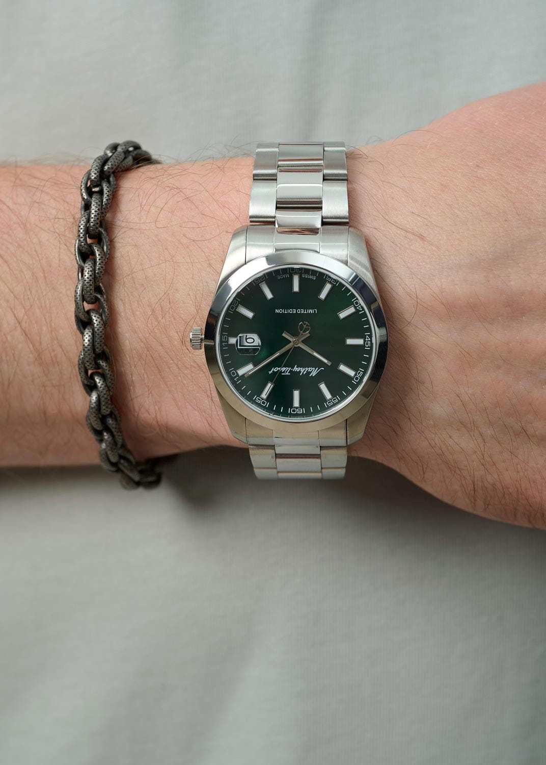Мужские кварцевые часы Mathey-Tissot Mathy H451VE — это стильное сочетание элегантности и современного дизайна. Лимитированная серия. Изящный корпус выполнен из нержавеющей стали, диаметром 42 мм, что придаст образу элегантности и надежности. Изысканный циферблат с метками в виде штрихов придает модели особый блеск. Циферблат защищен минеральным стекломМинеральное стеклоМинеральное стекло представляет собой искусственно выращенный минерал кварца. Такое стекло отличается особой устойчивостью к повреждениям и царапинам. Уступает по некоторым качествам сапфировому стеклу., обеспечивает устойчивость к царапинам. Стрелки и метки с люминесцентным покрытиемЛюминесцентное покрытиеПозволяет считывать показания времени в темноте. Производители наносят на стрелки, часовые индексы, безель или поверхность циферблата светонакопительный состав, дающий холодное свечение.. Циферблат с метками в виде штрихов выполнен по технологии Sunray (солнечные лучи). Окошко даты находится в положении 3 часа. Часы оснащены надежным кварцевым механизмом. Стальной браслет на раскладной застёжкеРаскладная застёжкаТакой тип застёжки используется только на браслетах из металла. Она никогда не раскрывается полностью, происходит разделение на 2 и более частей. Раскладывающая застёжка снизит вероятность потери часов к минимуму., гарантирует комфортное и безопасное ношение. Рифленая заводная головка. Класс водозащиты: 50 метров позволит защитить корпус от случайных брызг или капель дождя. Mathey-Tissot  — отличный выбор для тех, кто ценит утонченность и качество.