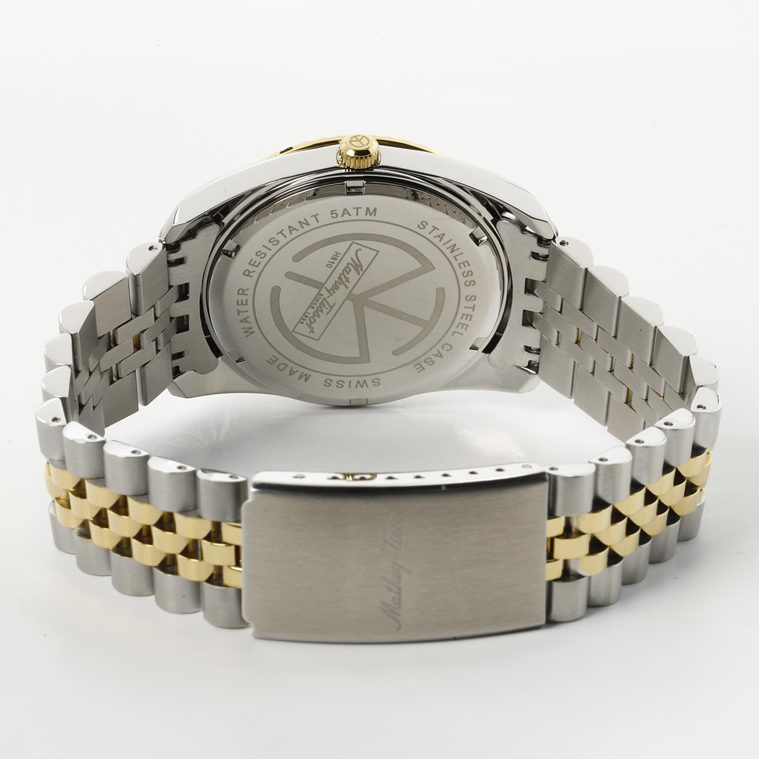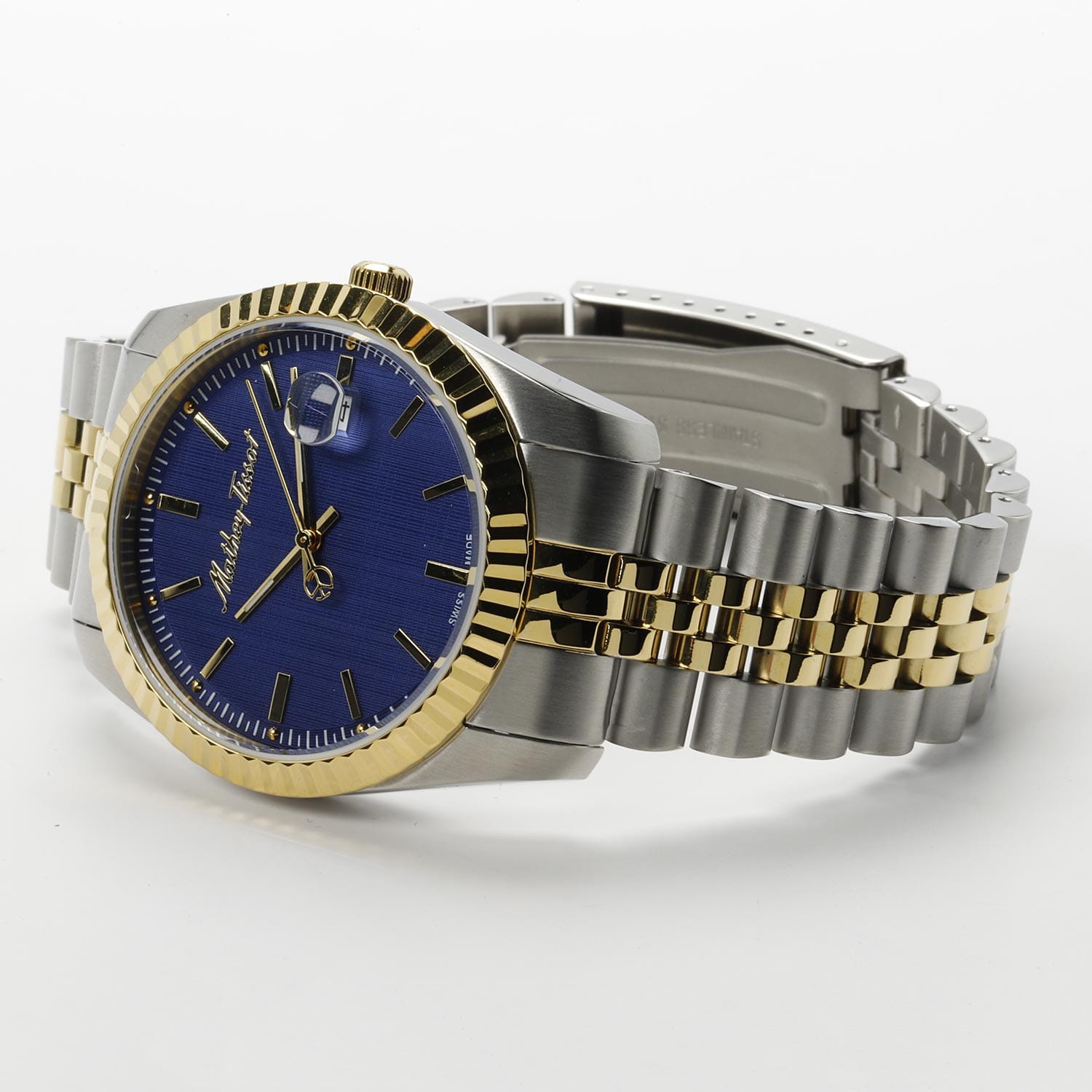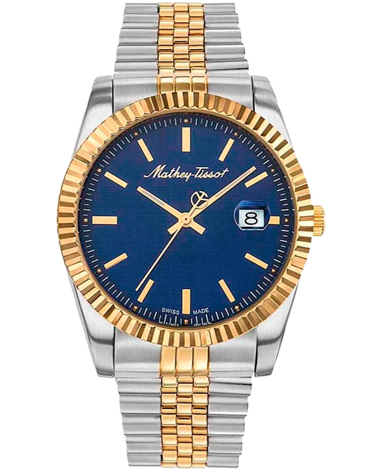 Мужские кварцевые часы Mathey-Tissot Mathy H810BBU — это стильное сочетание элегантности и современного дизайна. Изящный корпус выполнен из нержавеющей стали, диаметром 40 мм, что придаст образу элегантности и надежности. Изысканный циферблат с метками в виде штрихов придает модели особый блеск. Циферблат защищен минеральным стекломМинеральное стеклоМинеральное стекло представляет собой искусственно выращенный минерал кварца. Такое стекло отличается особой устойчивостью к повреждениям и царапинам. Уступает по некоторым качествам сапфировому стеклу., обеспечивает устойчивость к царапинам. Стрелки с люминесцентным покрытиемЛюминесцентное покрытиеПозволяет считывать показания времени в темноте. Производители наносят на стрелки, часовые индексы, безель или поверхность циферблата светонакопительный состав, дающий холодное свечение., которое светится в темноте после непродолжительной зарядки на свету. БезельБезельВнешний ободок, закрепляющий стекло. В спортивных часах так называется поворотное кольцо с делениями на циферблате, выполняет роль таймера – замеряет отрезки времени на шкале. Неподвижный безель – элемент декора. Однонаправленно вращающийся безель на дайверских часах позволяет фиксировать моменты погружения и выныривания на поверхность. с PVD-покрытиемPVDУльтратонкое покрытие наносится в технике вакуумного напыления, сочетает в себе нитрид титана особой прочности со слоем золота или оксида хрома. Несёт в себе декоративную или защитную функцию. золотистого цвета. Окошко даты находится в положении 3 часа. Часы оснащены надежным кварцевым механизмом. Стальной браслет с частичным PVD-покрытиемPVDУльтратонкое покрытие наносится в технике вакуумного напыления, сочетает в себе нитрид титана особой прочности со слоем золота или оксида хрома. Несёт в себе декоративную или защитную функцию. на раскладной застёжке с фиксаторомРаскладная застёжкаТакой тип застёжки используется только на браслетах из металла. Она никогда не раскрывается полностью, происходит разделение на 2 и более частей. Раскладывающая застёжка снизит вероятность потери часов к минимуму., гарантирует комфортное и безопасное ношение. Рифленая заводная головка. Класс водозащиты: 50 метров позволит защитить корпус от случайных брызг или капель дождя. Mathey-Tissot  — отличный выбор для тех, кто ценит утонченность и качество.