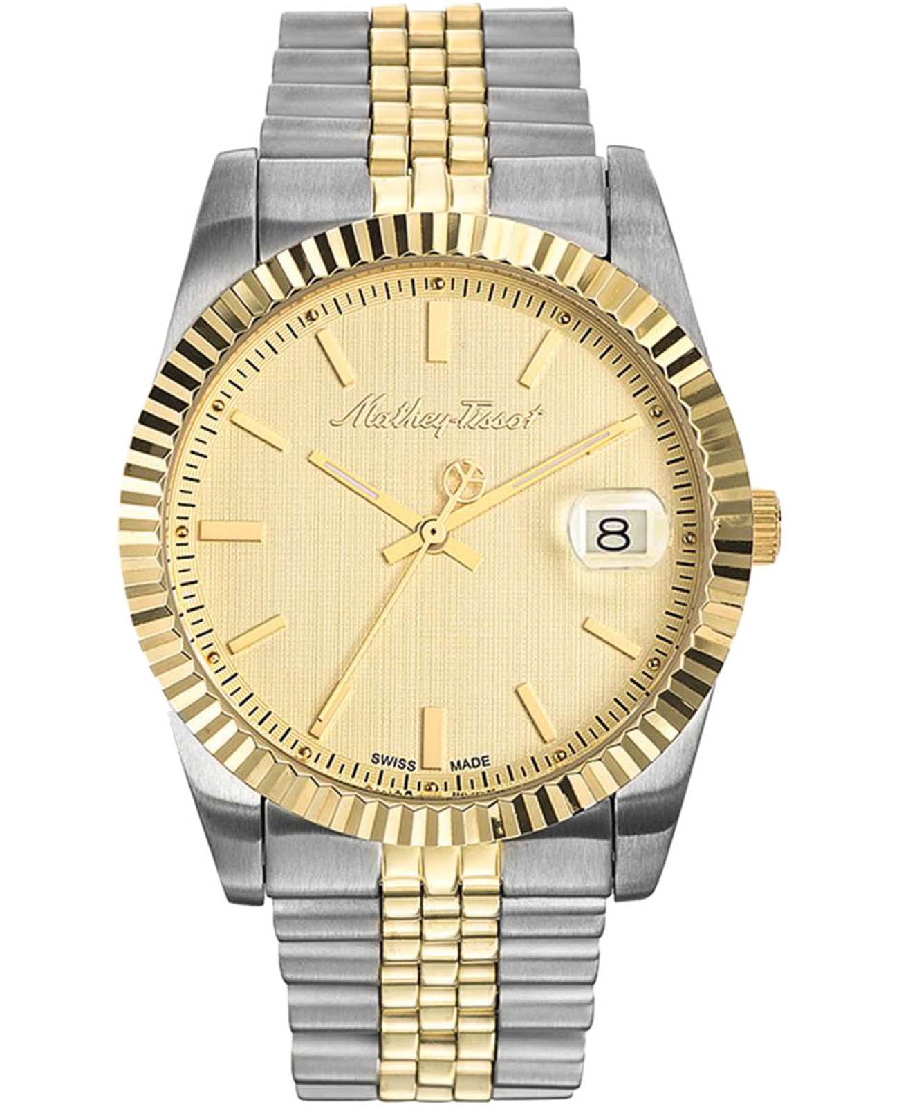 Мужские кварцевые часы Mathey-Tissot Mathy H810BDI — это стильное сочетание элегантности и современного дизайна. Изящный корпус выполнен из нержавеющей стали, диаметром 40 мм, что придаст образу элегантности и надежности. Изысканный циферблат с метками в виде штрихов придает модели особый блеск. Циферблат защищен минеральным стекломМинеральное стеклоМинеральное стекло представляет собой искусственно выращенный минерал кварца. Такое стекло отличается особой устойчивостью к повреждениям и царапинам. Уступает по некоторым качествам сапфировому стеклу., обеспечивает устойчивость к царапинам. Стрелки с люминесцентным покрытиемЛюминесцентное покрытиеПозволяет считывать показания времени в темноте. Производители наносят на стрелки, часовые индексы, безель или поверхность циферблата светонакопительный состав, дающий холодное свечение. SuperLumiNova, которое светится в темноте после непродолжительной зарядки на свету. БезельБезельВнешний ободок, закрепляющий стекло. В спортивных часах так называется поворотное кольцо с делениями на циферблате, выполняет роль таймера – замеряет отрезки времени на шкале. Неподвижный безель – элемент декора. Однонаправленно вращающийся безель на дайверских часах позволяет фиксировать моменты погружения и выныривания на поверхность. с PVD-покрытиемPVDУльтратонкое покрытие наносится в технике вакуумного напыления, сочетает в себе нитрид титана особой прочности со слоем золота или оксида хрома. Несёт в себе декоративную или защитную функцию. золотистого цвета. Окошко даты находится в положении 3 часа. Часы оснащены надежным кварцевым механизмом. Стальной браслет с частичным PVD-покрытиемPVDУльтратонкое покрытие наносится в технике вакуумного напыления, сочетает в себе нитрид титана особой прочности со слоем золота или оксида хрома. Несёт в себе декоративную или защитную функцию. на раскладной застёжке с фиксаторомРаскладная застёжкаТакой тип застёжки используется только на браслетах из металла. Она никогда не раскрывается полностью, происходит разделение на 2 и более частей. Раскладывающая застёжка снизит вероятность потери часов к минимуму., гарантирует комфортное и безопасное ношение. Рифленая заводная головка. Класс водозащиты: 50 метров позволит защитить корпус от случайных брызг или капель дождя. Mathey-Tissot  — отличный выбор для тех, кто ценит утонченность и качество.
