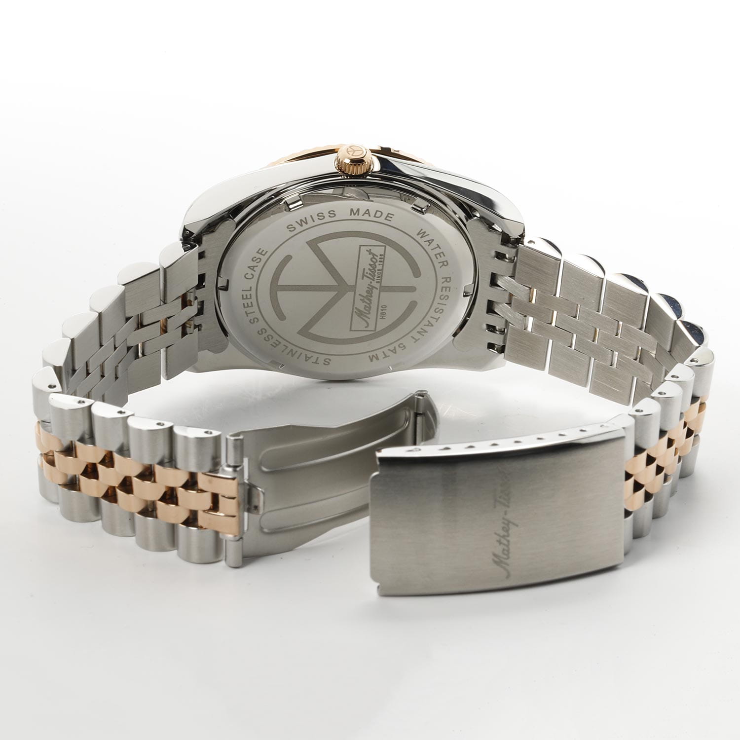 Мужские кварцевые часы Mathey-Tissot Mathy H810RN — это стильное сочетание элегантности и современного дизайна. Изящный корпус выполнен из нержавеющей стали, диаметром 40 мм, что придаст образу элегантности и надежности. Изысканный циферблат с метками в виде штрихов придает модели особый блеск. Циферблат защищен минеральным стекломМинеральное стеклоМинеральное стекло представляет собой искусственно выращенный минерал кварца. Такое стекло отличается особой устойчивостью к повреждениям и царапинам. Уступает по некоторым качествам сапфировому стеклу., обеспечивает устойчивость к царапинам. Стрелки с люминесцентным покрытиемЛюминесцентное покрытиеПозволяет считывать показания времени в темноте. Производители наносят на стрелки, часовые индексы, безель или поверхность циферблата светонакопительный состав, дающий холодное свечение., которое светится в темноте после непродолжительной зарядки на свету. БезельБезельВнешний ободок, закрепляющий стекло. В спортивных часах так называется поворотное кольцо с делениями на циферблате, выполняет роль таймера – замеряет отрезки времени на шкале. Неподвижный безель – элемент декора. Однонаправленно вращающийся безель на дайверских часах позволяет фиксировать моменты погружения и выныривания на поверхность. с PVD-покрытиемPVDУльтратонкое покрытие наносится в технике вакуумного напыления, сочетает в себе нитрид титана особой прочности со слоем золота или оксида хрома. Несёт в себе декоративную или защитную функцию. цвета розового золота. Окошко даты находится в положении 3 часа. Часы оснащены надежным кварцевым механизмом. Стальной браслет с частичным PVD-покрытиемPVDУльтратонкое покрытие наносится в технике вакуумного напыления, сочетает в себе нитрид титана особой прочности со слоем золота или оксида хрома. Несёт в себе декоративную или защитную функцию. на раскладной застёжке с фиксаторомРаскладная застёжкаТакой тип застёжки используется только на браслетах из металла. Она никогда не раскрывается полностью, происходит разделение на 2 и более частей. Раскладывающая застёжка снизит вероятность потери часов к минимуму., гарантирует комфортное и безопасное ношение. Рифленая заводная головка. Класс водозащиты: 50 метров позволит защитить корпус от случайных брызг или капель дождя. Mathey-Tissot — отличный выбор для тех, кто ценит утонченность и качество.