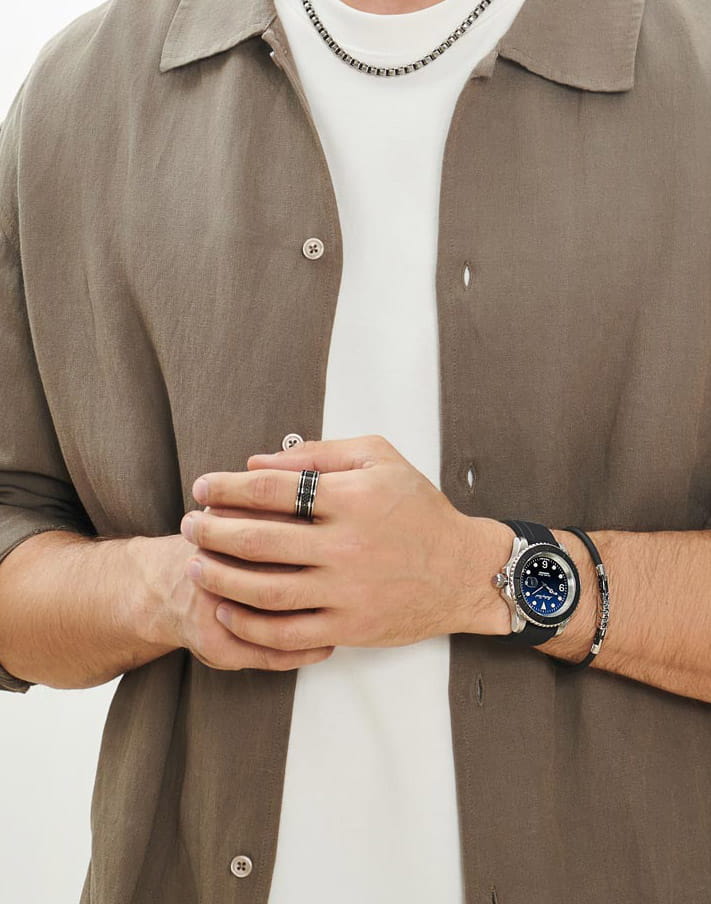 Мужские кварцевые часы Mathey-Tissot Mathy H909ABU— это стильное сочетание элегантности и современного дизайна. Изящный корпус выполнен из нержавеющей стали, диаметром 42 мм, что придаст образу элегантности и надежности. Циферблат с метками в виде точек и арабских цифр придает модели особый блеск. Циферблат защищен минеральным стекломМинеральное стеклоМинеральное стекло представляет собой искусственно выращенный минерал кварца. Такое стекло отличается особой устойчивостью к повреждениям и царапинам. Уступает по некоторым качествам сапфировому стеклу. с сапфировым покрытием, обеспечивает устойчивость к царапинам. Стрелки и метки с люминесцентным покрытиемЛюминесцентное покрытиеПозволяет считывать показания времени в темноте. Производители наносят на стрелки, часовые индексы, безель или поверхность циферблата светонакопительный состав, дающий холодное свечение.. Окошко даты находится в положении 3 часа.  Вращающийся безельБезельВнешний ободок, закрепляющий стекло. В спортивных часах так называется поворотное кольцо с делениями на циферблате, выполняет роль таймера – замеряет отрезки времени на шкале. Неподвижный безель – элемент декора. Однонаправленно вращающийся безель на дайверских часах позволяет фиксировать моменты погружения и выныривания на поверхность. в одном направлении. Часы оснащены надежным кварцевым механизмом. Силиконовый ремешок с раскладной застёжкойРаскладная застёжкаТакой тип застёжки используется только на браслетах из металла. Она никогда не раскрывается полностью, происходит разделение на 2 и более частей. Раскладывающая застёжка снизит вероятность потери часов к минимуму. гарантирует комфортное и безопасное ношение. Класс водозащиты: 200 метров позволит плавать, нырять и заниматься другими водными видами спорта. Mathey-Tissot  — отличный выбор для тех, кто ценит утонченность и качество.