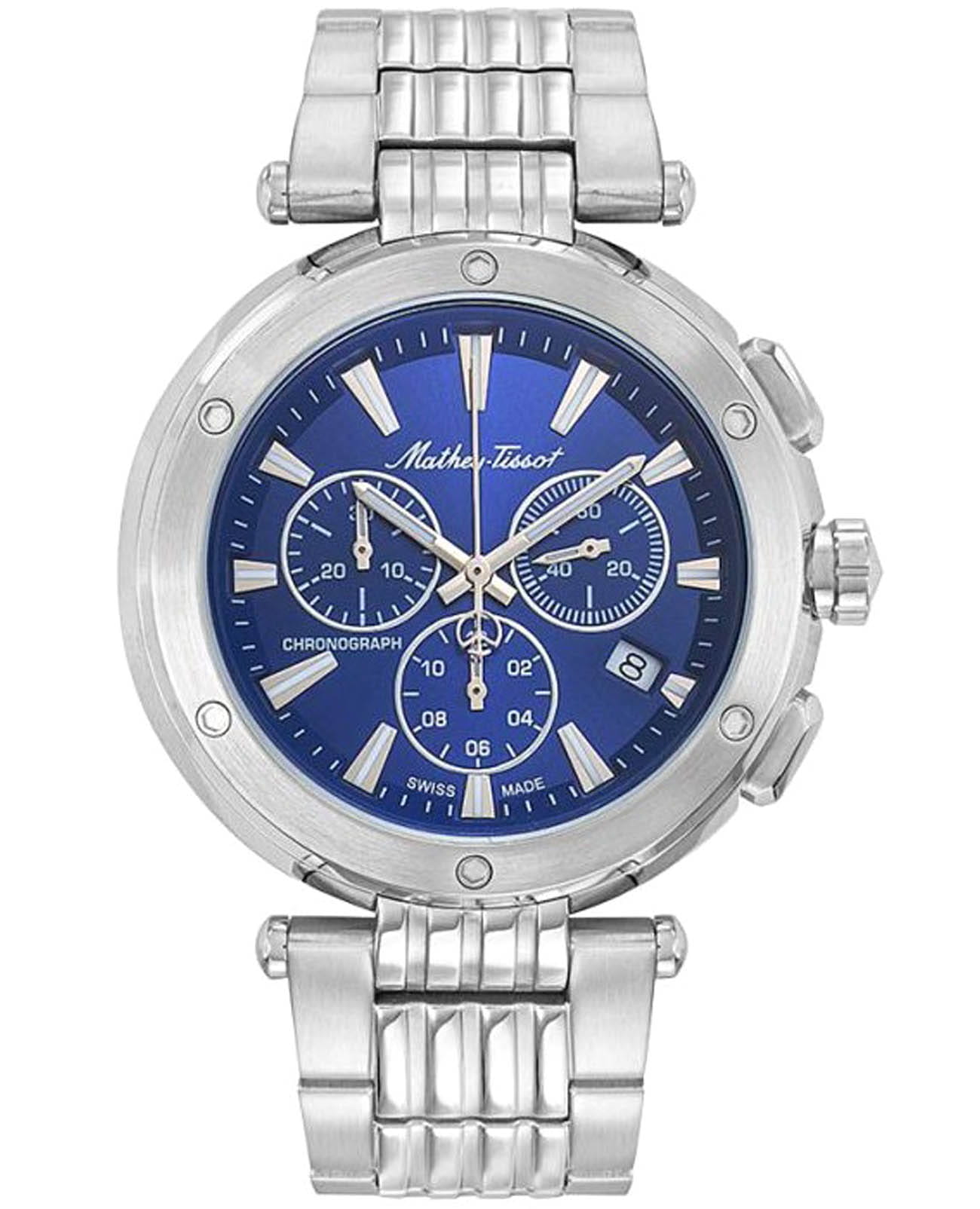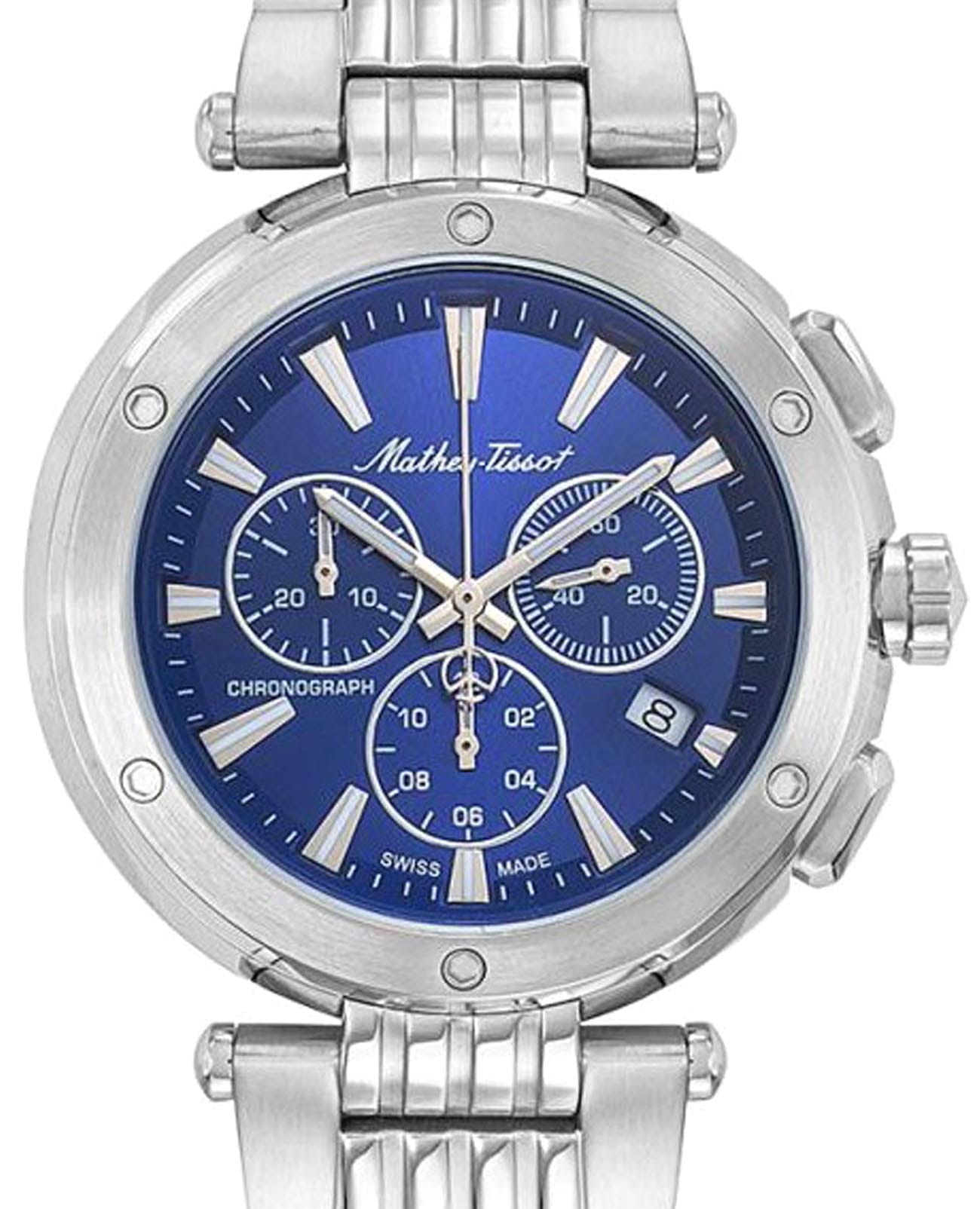 Мужские кварцевые часы-хронографХронографФункция позволяет измерять отрезки времени с особой точностью: часы, минуты, секунды. Верным признаком хронографа является наличие на циферблате 3 дополнительных окошек-счётчиков. Mathey-Tissot Neptune H912CHABU — это стильное сочетание элегантности и современного дизайна. Изящный корпус выполнен из нержавеющей стали серебристого цвета, диаметром 42 мм, что придаст образу элегантности и надежности. Изысканный циферблат с метками в виде штрихов придает модели особый блеск. Циферблат защищен минеральным стекломМинеральное стеклоМинеральное стекло представляет собой искусственно выращенный минерал кварца. Такое стекло отличается особой устойчивостью к повреждениям и царапинам. Уступает по некоторым качествам сапфировому стеклу. с сапфировым покрытием, обеспечивает устойчивость к царапинам. Стрелки и метки с люминесцентным покрытиемЛюминесцентное покрытиеПозволяет считывать показания времени в темноте. Производители наносят на стрелки, часовые индексы, безель или поверхность циферблата светонакопительный состав, дающий холодное свечение.. БезельБезельВнешний ободок, закрепляющий стекло. В спортивных часах так называется поворотное кольцо с делениями на циферблате, выполняет роль таймера – замеряет отрезки времени на шкале. Неподвижный безель – элемент декора. Однонаправленно вращающийся безель на дайверских часах позволяет фиксировать моменты погружения и выныривания на поверхность. украшен винтами. Окошко даты находится в положении 4 часа. Часы оснащены надежным кварцевым механизмом. Стальной браслет на застёжке-бабочке с кнопкамиЗастёжка "бабочка"Такой вид застёжки дополняется предохранителями, помогающими избежать случайного раскрытия браслета. Обладают изящным исполнением. , гарантирует комфортное и безопасное ношение. Класс водозащиты: 50 метров позволит защитить корпус от случайных брызг или капель дождя. Mathey-Tissot  — отличный выбор для тех, кто ценит утонченность и качество.