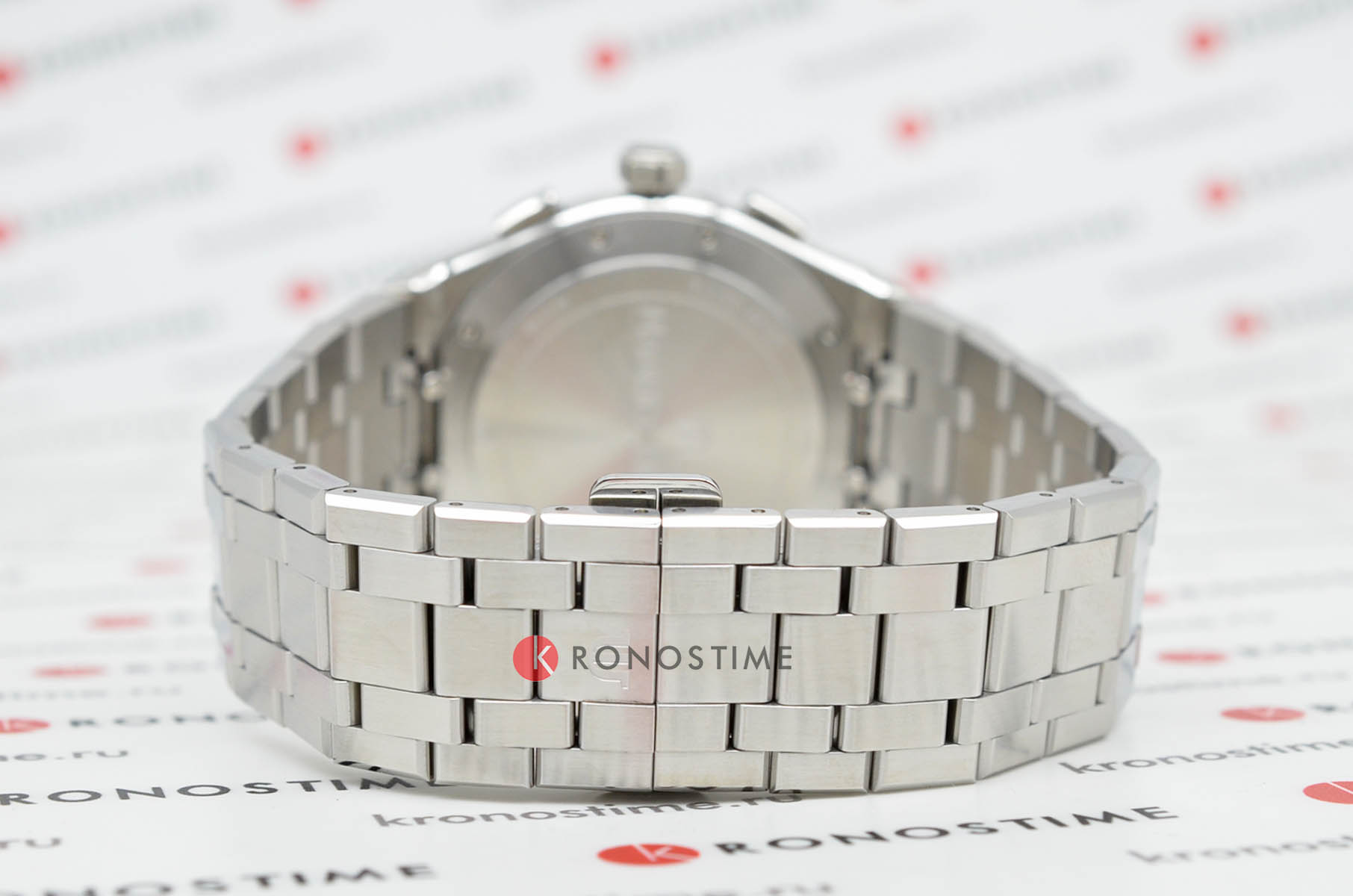 Модель оснащена кварцевым механизмом с хронографомХронографФункция позволяет измерять отрезки времени с особой точностью: часы, минуты, секунды. Верным признаком хронографа является наличие на циферблате 3 дополнительных окошек-счётчиков., включающим центральную секундную стрелку, 30-минутный счётчик на «9 часах» и 1/10-секундный счётчик на «12 часах». Функционал дополнен индикацией даты в положении «6 часов».
