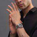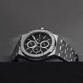 Модель оснащена кварцевым механизмом с функцией хронографаХронографФункция позволяет измерять отрезки времени с особой точностью: часы, минуты, секунды. Верным признаком хронографа является наличие на циферблате 3 дополнительных окошек-счётчиков., включающей центральную секундную стрелку, 30-минутный счётчик на позиции «9 часов» и 1/10-секундный счётчик на позиции «12 часов». Индикация даты расположена в положении «6 часов».