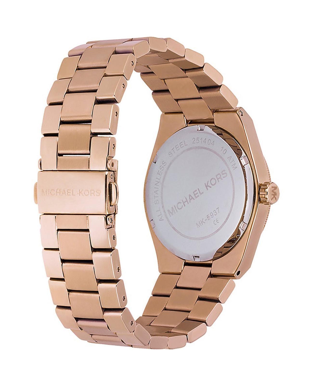 Женские американские часы Michael Kors Channing MK5937, кварцевый механизм с высокой точностью. Минеральное стеклоМинеральное стеклоМинеральное стекло представляет собой искусственно выращенный минерал кварца. Такое стекло отличается особой устойчивостью к повреждениям и царапинам. Уступает по некоторым качествам сапфировому стеклу., устойчивое к мелким механическим повреждениям. Корпус часов выполнен из нержавеющей стали с PVD-покрытиемPVDУльтратонкое покрытие наносится в технике вакуумного напыления, сочетает в себе нитрид титана особой прочности со слоем золота или оксида хрома. Несёт в себе декоративную или защитную функцию.. Класс водозащиты: 100 метров, позволит плавать, нырять и заниматься другими водными видами спорта. Стальной браслет с PVD-покрытиемPVDУльтратонкое покрытие наносится в технике вакуумного напыления, сочетает в себе нитрид титана особой прочности со слоем золота или оксида хрома. Несёт в себе декоративную или защитную функцию. на раскладной застёжкеРаскладная застёжкаТакой тип застёжки используется только на браслетах из металла. Она никогда не раскрывается полностью, происходит разделение на 2 и более частей. Раскладывающая застёжка снизит вероятность потери часов к минимуму..