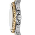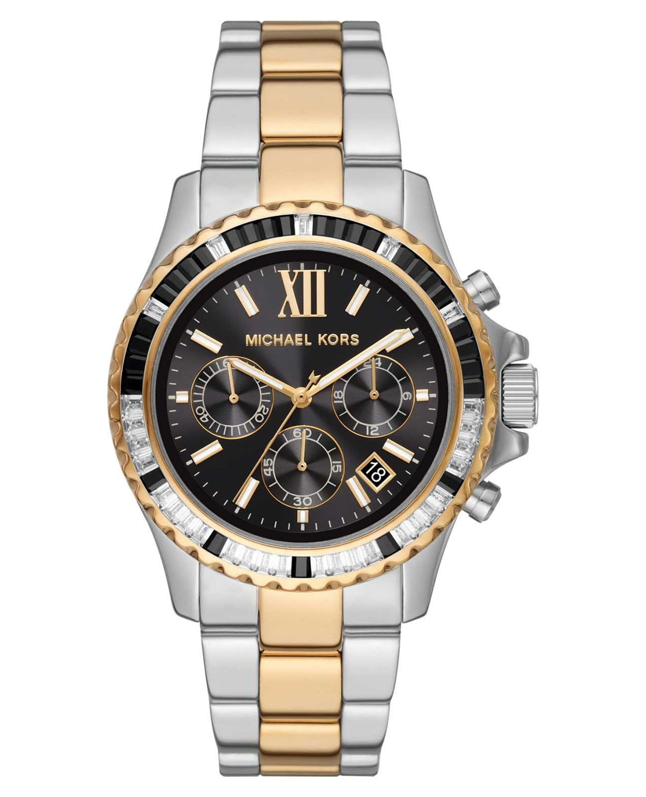 Женские американские часы-хронографХронографФункция позволяет измерять отрезки времени с особой точностью: часы, минуты, секунды. Верным признаком хронографа является наличие на циферблате 3 дополнительных окошек-счётчиков. с секундомеромСекундомерСекундоме́р — прибор, способный измерять интервалы времени с точностью до долей секунды. и с минеральным стекломМинеральное стеклоМинеральное стекло представляет собой искусственно выращенный минерал кварца. Такое стекло отличается особой устойчивостью к повреждениям и царапинам. Уступает по некоторым качествам сапфировому стеклу. Michael Kors Everest MK7209, кварцевый механизм с высокой точностью. Корпус часов изготовлен из нержавеющей стали. БезельБезельВнешний ободок, закрепляющий стекло. В спортивных часах так называется поворотное кольцо с делениями на циферблате, выполняет роль таймера – замеряет отрезки времени на шкале. Неподвижный безель – элемент декора. Однонаправленно вращающийся безель на дайверских часах позволяет фиксировать моменты погружения и выныривания на поверхность. с PVD-покрытиемPVDУльтратонкое покрытие наносится в технике вакуумного напыления, сочетает в себе нитрид титана особой прочности со слоем золота или оксида хрома. Несёт в себе декоративную или защитную функцию.украшен кристаллами. Циферблат выполнен по технологии Sunray (солнечные лучи). Три дополнительных индикатора. Метки в виде штрихов и римских цифр. Окошко даты находится между 4 и 5 часами. Стрелки с люминесцентным покрытиемЛюминесцентное покрытиеПозволяет считывать показания времени в темноте. Производители наносят на стрелки, часовые индексы, безель или поверхность циферблата светонакопительный состав, дающий холодное свечение.. Заводная головка с защитой. Класс водозащиты: 100 метров, позволит плавать, нырять и заниматься другими водными видами спорта. Стальной браслет с частичным PVD-покрытиемPVDУльтратонкое покрытие наносится в технике вакуумного напыления, сочетает в себе нитрид титана особой прочности со слоем золота или оксида хрома. Несёт в себе декоративную или защитную функцию. на раскладной застёжкеРаскладная застёжкаТакой тип застёжки используется только на браслетах из металла. Она никогда не раскрывается полностью, происходит разделение на 2 и более частей. Раскладывающая застёжка снизит вероятность потери часов к минимуму..