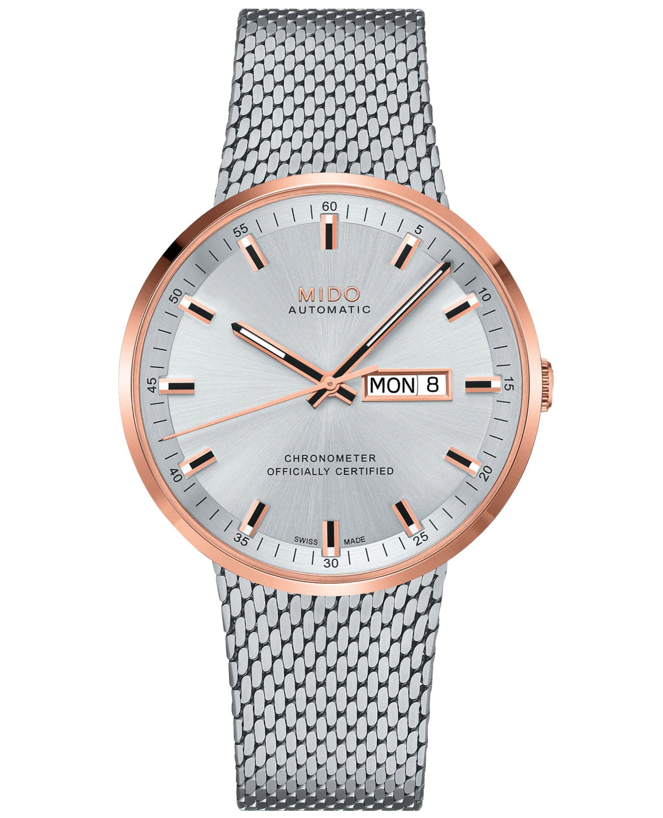 Швейцарские часы Commander Icone отдают дань уважения одной из самых культовых моделей Mido. Мужские швейцарские механические часы с автоподзаводом Mido Commander Icone M031.631.21.031.00, механический механизм (автоматический калибр) с высокой точностью. Сапфировое стеклоСапфировое стеклоПрочный и надёжный материал из кристалла сапфира синтетического происхождения, характеризующийся особой твёрдостью и устойчивостью к царапинам и повреждениям. устойчивое к появлению царапин, обладающее высокой прозрачностью. Класс водозащиты: 50 метров, позволит защитить корпус от случайных брызг или капель дождя. Корпус часов изготовлен из стали. Стальной браслет на раскладной застёжкеРаскладная застёжкаТакой тип застёжки используется только на браслетах из металла. Она никогда не раскрывается полностью, происходит разделение на 2 и более частей. Раскладывающая застёжка снизит вероятность потери часов к минимуму.. БезельБезельВнешний ободок, закрепляющий стекло. В спортивных часах так называется поворотное кольцо с делениями на циферблате, выполняет роль таймера – замеряет отрезки времени на шкале. Неподвижный безель – элемент декора. Однонаправленно вращающийся безель на дайверских часах позволяет фиксировать моменты погружения и выныривания на поверхность. с PVD-покрытиемPVDУльтратонкое покрытие наносится в технике вакуумного напыления, сочетает в себе нитрид титана особой прочности со слоем золота или оксида хрома. Несёт в себе декоративную или защитную функцию.. Нео-винтажный дизайн вобрал в себя большинство кодов, ответственных за успех Commander: чрезвычайно чистые линии, максимальное пространство, предоставленное превосходному сатинированному циферблату с эффектом солнечных лучей, и браслету с миланским плетением. Модель оснащена COSCСертификат COSCОфициальный сертификат, подтверждающий то, что часы ходят с особо высокой точностью. Для получения документа часы подвергаются тестовым испытаниям, разработанным швейцарским институтом тестирования хронометров COSC. Допустимая норма для механических часов -4/+6 секунд в день, для кварцевых моделей +/- 0,07 секунд в день. сертифицированным автоматическим механизмом Caliber 80 Chronometer Silicon с кремниевой пружиной баланса, обеспечивающим превосходную точность и запас хода до 80 часов. Стрелки и метки с люминесцентным покрытиемЛюминесцентное покрытиеПозволяет считывать показания времени в темноте. Производители наносят на стрелки, часовые индексы, безель или поверхность циферблата светонакопительный состав, дающий холодное свечение.. Окошки дня недели и даты находятся в положении 3 часа.