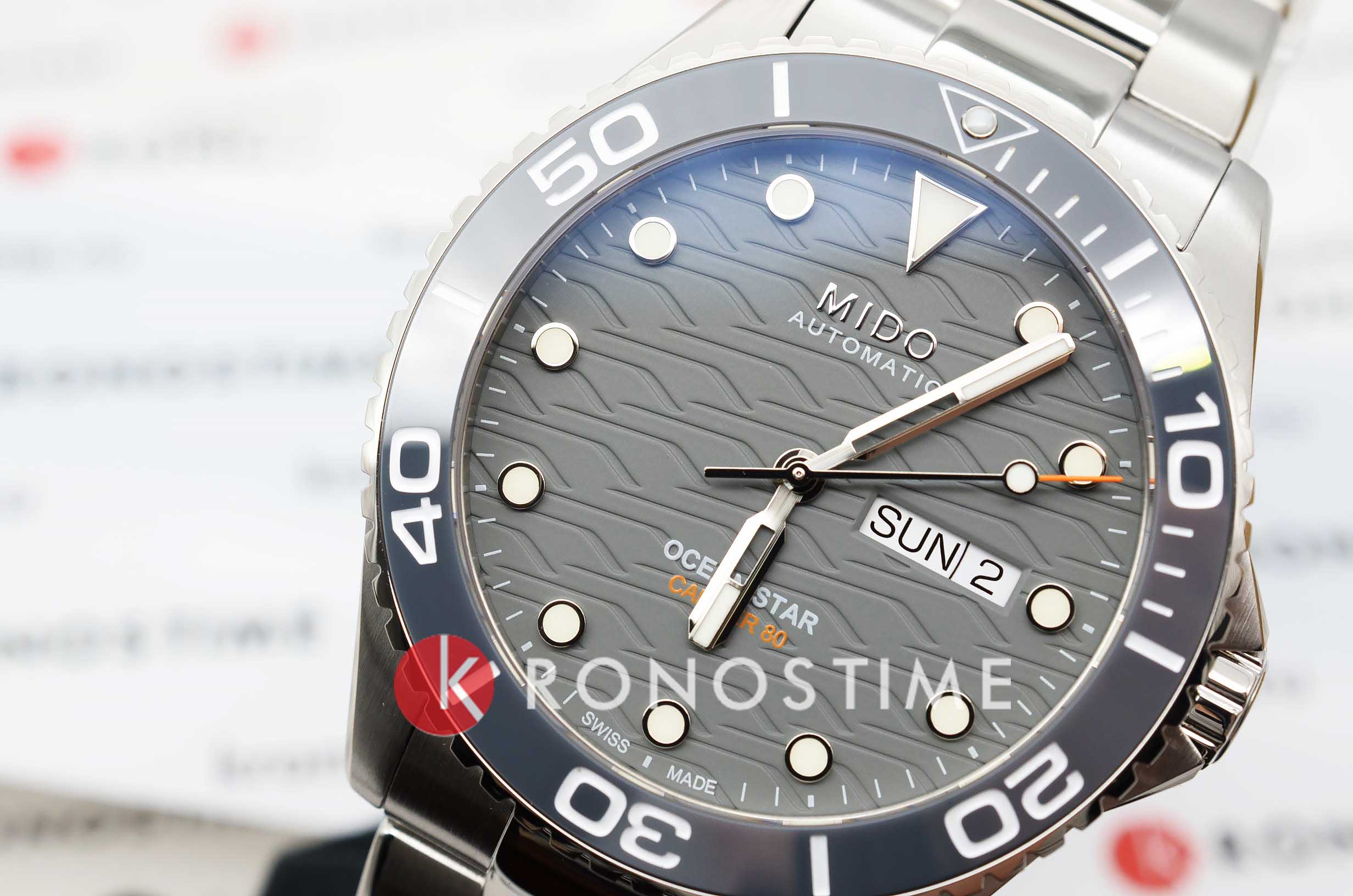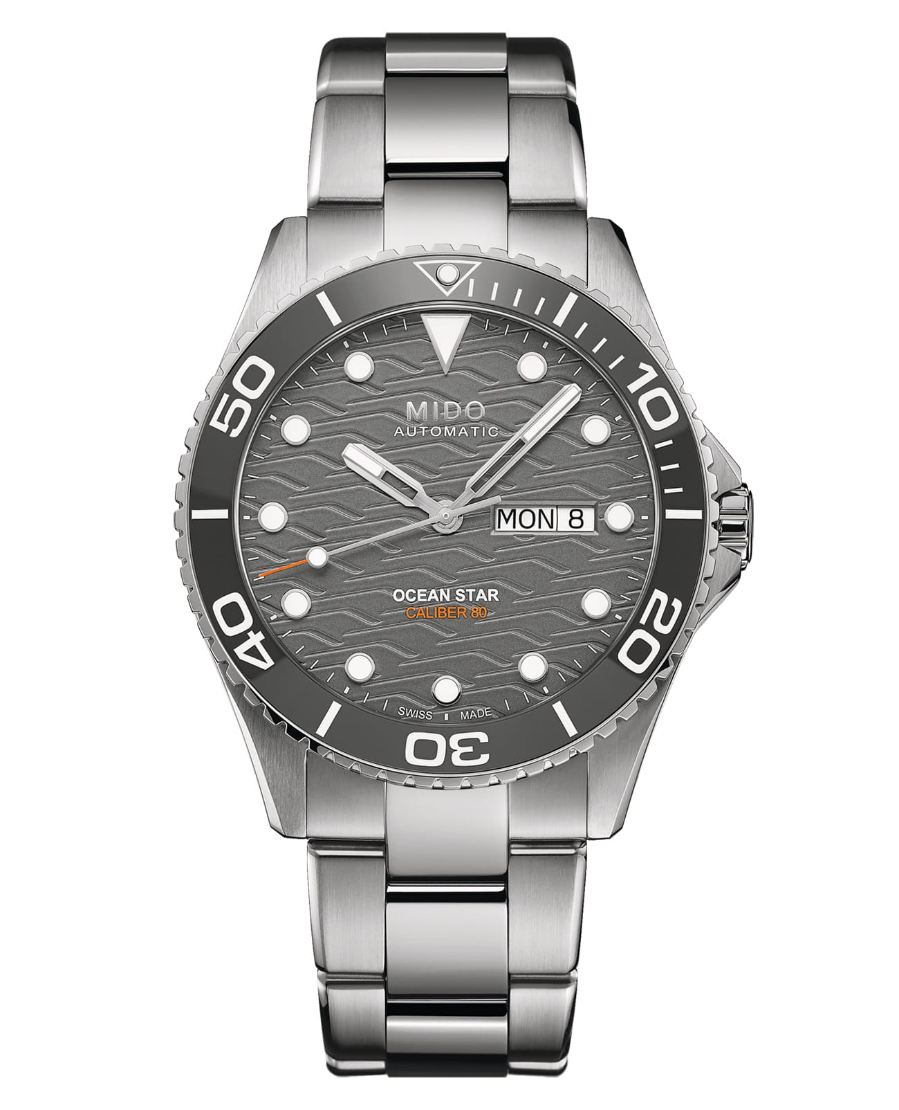 Часы MIDO Ocean Star 200C (артикул M042.430.11.081.00) сочетают элегантный дизайн и высокую функциональность, подходя как для повседневного ношения, так и для водных приключений. Корпус диаметром 42,5 мм выполнен из нержавеющей стали с водозащитой до 20 бар (200 метров). Однонаправленная вращающаяся безель, завинчивающаяся заводная головка и задняя крышка подчёркивают практичность. Серый циферблат с волнообразным узором оснащён накладными часовыми метками и стрелками с покрытием Super-LumiNova®Люминесцентное покрытиеПозволяет считывать показания времени в темноте. Производители наносят на стрелки, часовые индексы, безель или поверхность циферблата светонакопительный состав, дающий холодное свечение.. Окошки даты и дня недели расположены в положении «3 часа». Циферблат защищён сапфировым стекломСапфировое стеклоПрочный и надёжный материал из кристалла сапфира синтетического происхождения, характеризующийся особой твёрдостью и устойчивостью к царапинам и повреждениям. с двусторонним антибликовым покрытием.