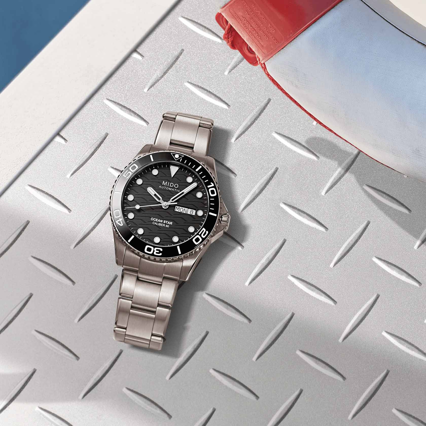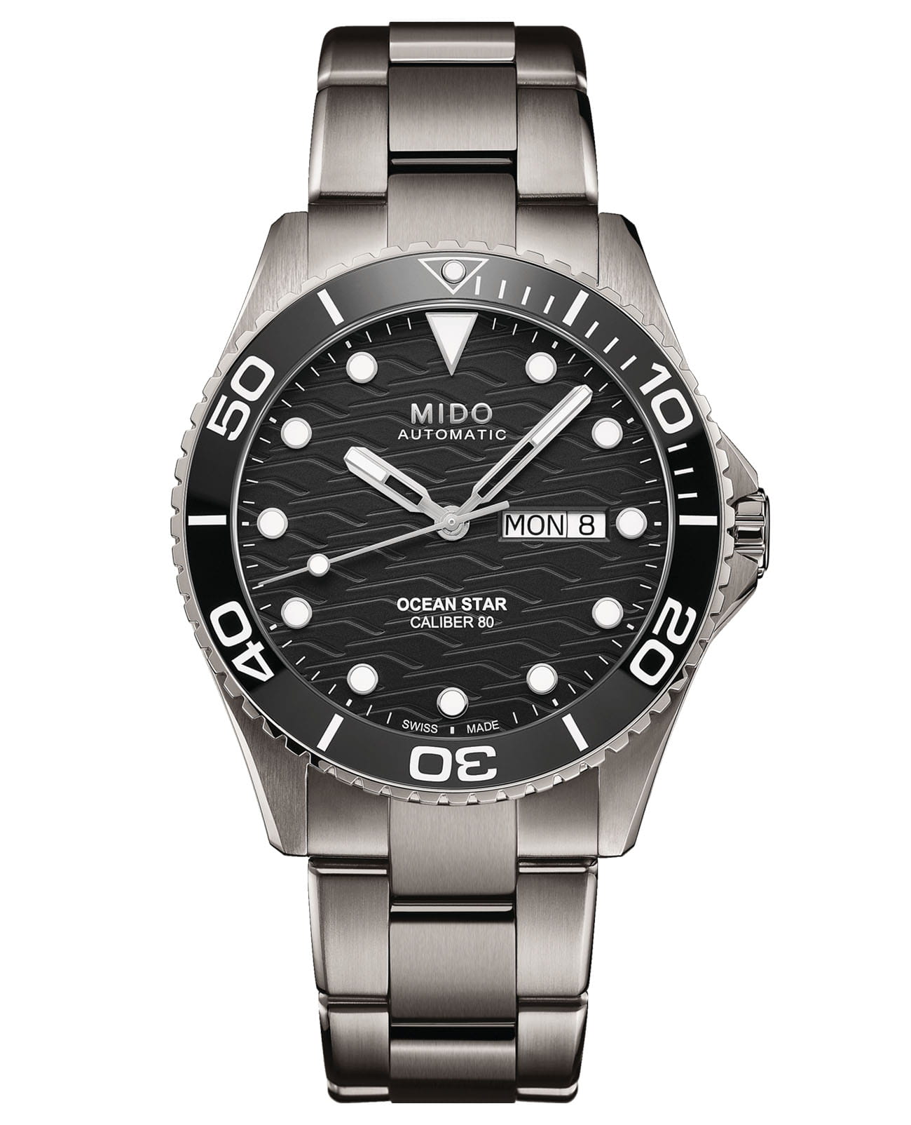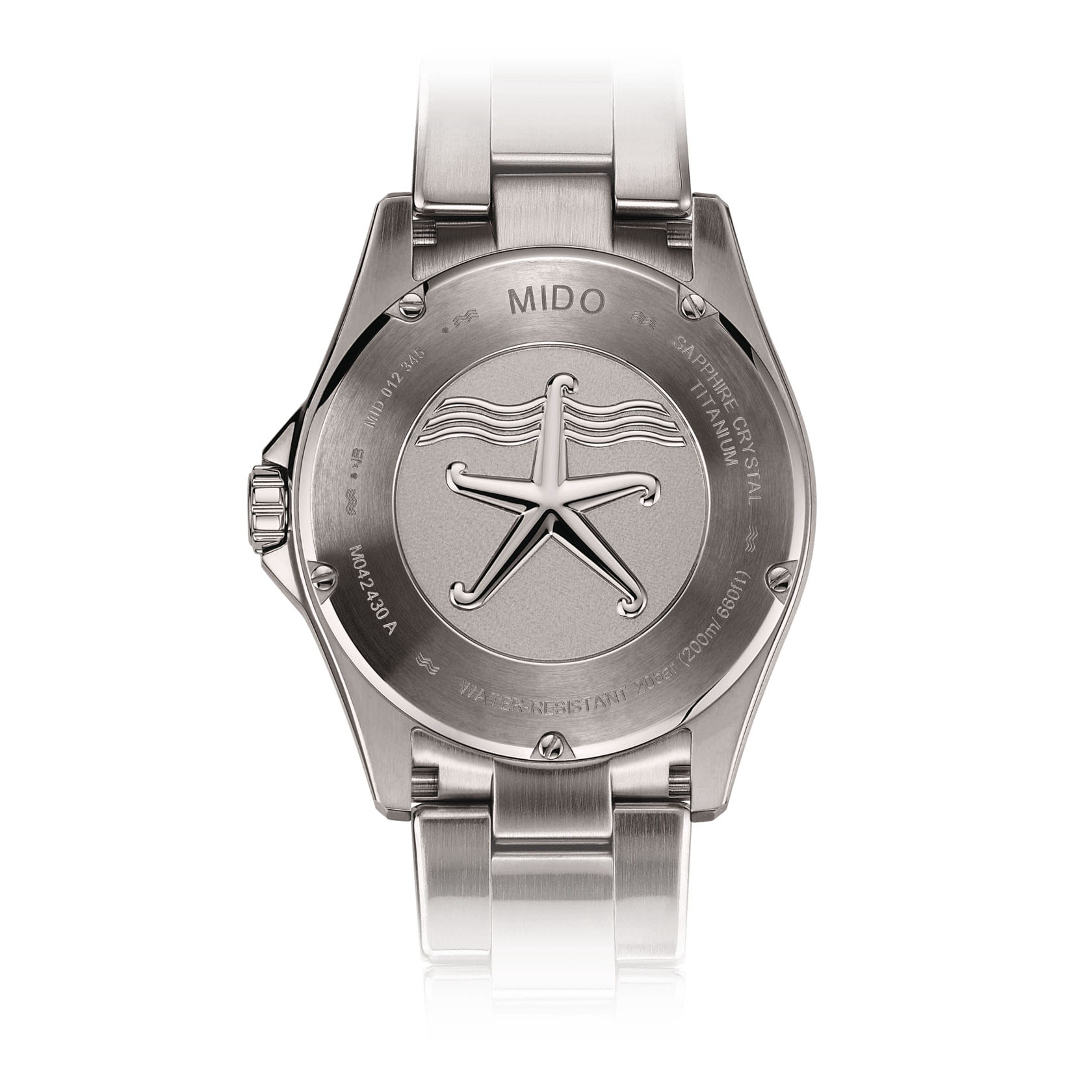 Часы MIDO Ocean Star 200C Titanium (артикул M042.430.44.051.00) сочетают элегантный дизайн и высокую функциональность, подходя как для повседневного ношения, так и для водных приключений. Корпус диаметром 42,5 мм выполнен из лёгкого и прочного титана с водозащитой до 20 бар (200 метров). Однонаправленная вращающаяся безель, завинчивающаяся заводная головка и задняя крышка подчёркивают практичность. Чёрный циферблат с волнообразным узором оснащён накладными часовыми метками и стрелками с покрытием Super-LumiNova®Люминесцентное покрытиеПозволяет считывать показания времени в темноте. Производители наносят на стрелки, часовые индексы, безель или поверхность циферблата светонакопительный состав, дающий холодное свечение.. Окошки даты и дня недели расположены в положении «3 часа». Циферблат защищён сапфировым стекломСапфировое стеклоПрочный и надёжный материал из кристалла сапфира синтетического происхождения, характеризующийся особой твёрдостью и устойчивостью к царапинам и повреждениям. с двусторонним антибликовым покрытием.