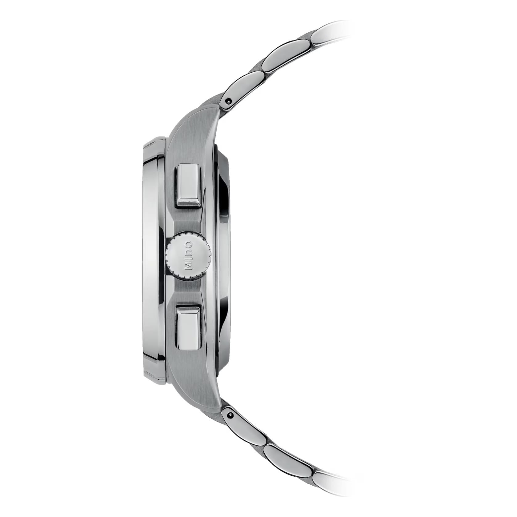 Мужские механические швейцарские часы Mido Multifort TV Chronograph M049.527.11.081.00, механический механизм с высокой точностью. Сапфировое стеклоСапфировое стеклоПрочный и надёжный материал из кристалла сапфира синтетического происхождения, характеризующийся особой твёрдостью и устойчивостью к царапинам и повреждениям. устойчивое к появлению царапин, обладающее высокой прозрачностью. Корпус часов изготовлен из нержавеющей стали. В механизм внедрена пружина баланса Nivachron™Nivachron™Специально разработанный инновационный сплав Nivachron™ повышает устойчивость часов к воздействию магнитных полей.. Стрелки с люминесцентным покрытиемЛюминесцентное покрытиеПозволяет считывать показания времени в темноте. Производители наносят на стрелки, часовые индексы, безель или поверхность циферблата светонакопительный состав, дающий холодное свечение.. Окошко даты в положении между 4 и 6 часами. Класс водозащиты: 100 метров, позволит плавать, нырять и заниматься другими водными видами спорта. Стальной браслет на раскладной застёжкеРаскладная застёжкаТакой тип застёжки используется только на браслетах из металла. Она никогда не раскрывается полностью, происходит разделение на 2 и более частей. Раскладывающая застёжка снизит вероятность потери часов к минимуму.. Часы с функциями хронографаХронографФункция позволяет измерять отрезки времени с особой точностью: часы, минуты, секунды. Верным признаком хронографа является наличие на циферблате 3 дополнительных окошек-счётчиков. и тахиметраТахиметрРазмеченная шкала, располагается на ободке или безеле часов. Тахиметр позволяет рассчитать скорость на определённом участке пути, расстояние измеряется в километрах или милях..Поставляются с дополнительным ремешком, что обеспечивает еще большую универсальность и комфорт.