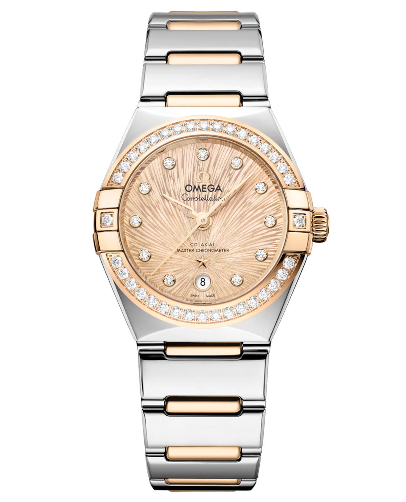Окутанные тайной космического сияния, часы OMEGA Constellation воплощают в себе магию звездного неба, заключенную в фирменный корпус с изящными полукруглыми гранями и отполированными до зеркального блеска боковыми скобами. Эта 29-миллиметровая модель, созданная из гармоничного сочетания нержавеющей стали и 18-каратного золота18-каратное золотоОбозначение по каратной системе пробирования, оно показывает, сколько драгоценного металла содержится в изделии. 18 карат - в составе 75% чистого золота, соответствует 750 пробе.