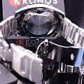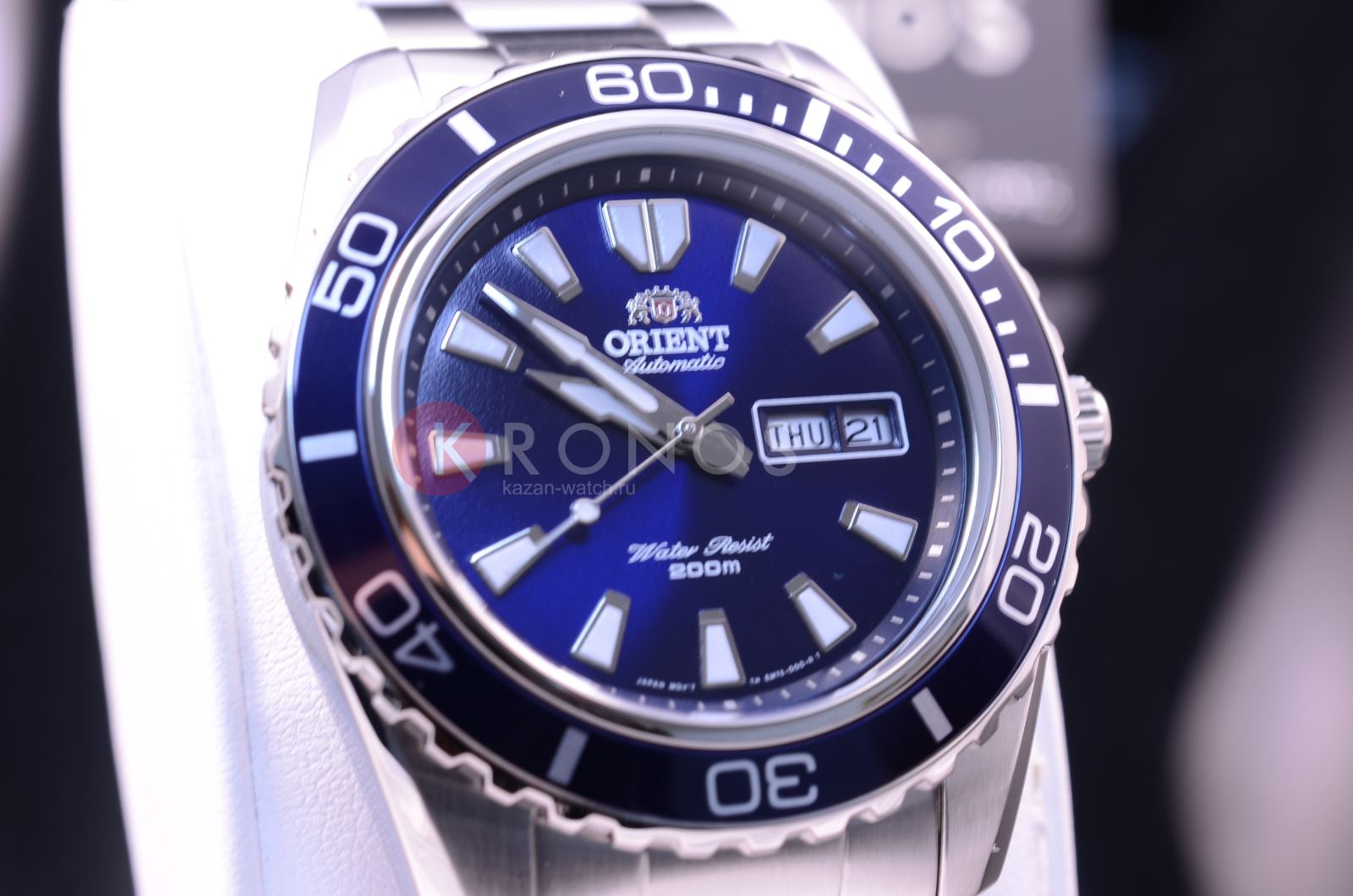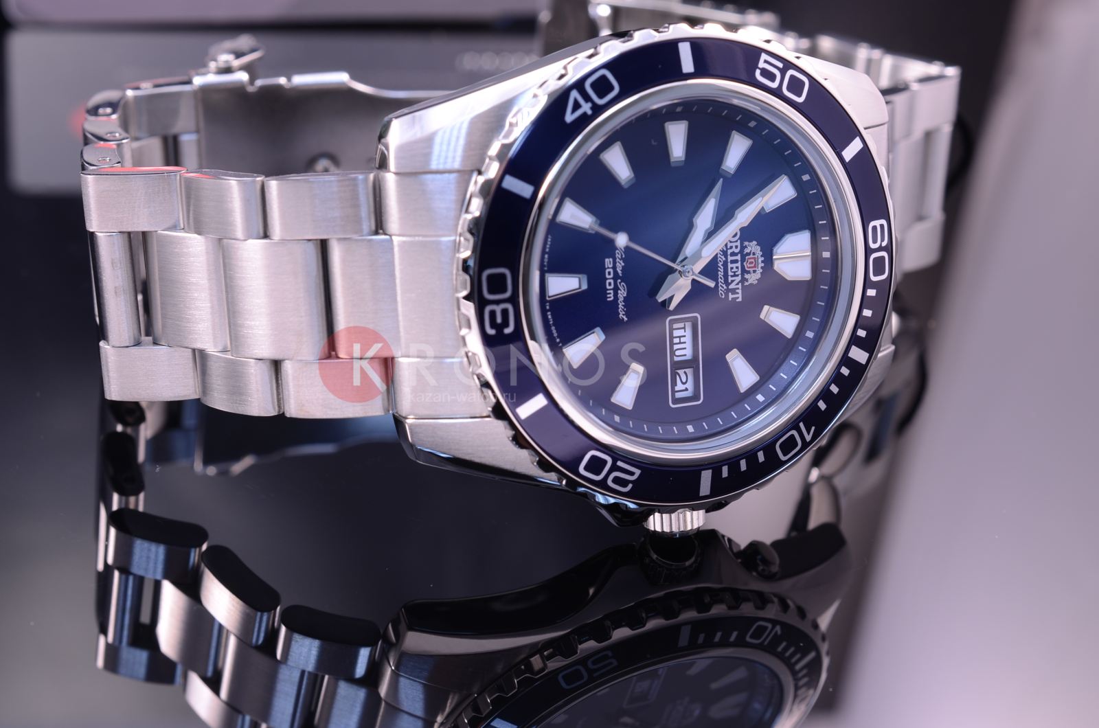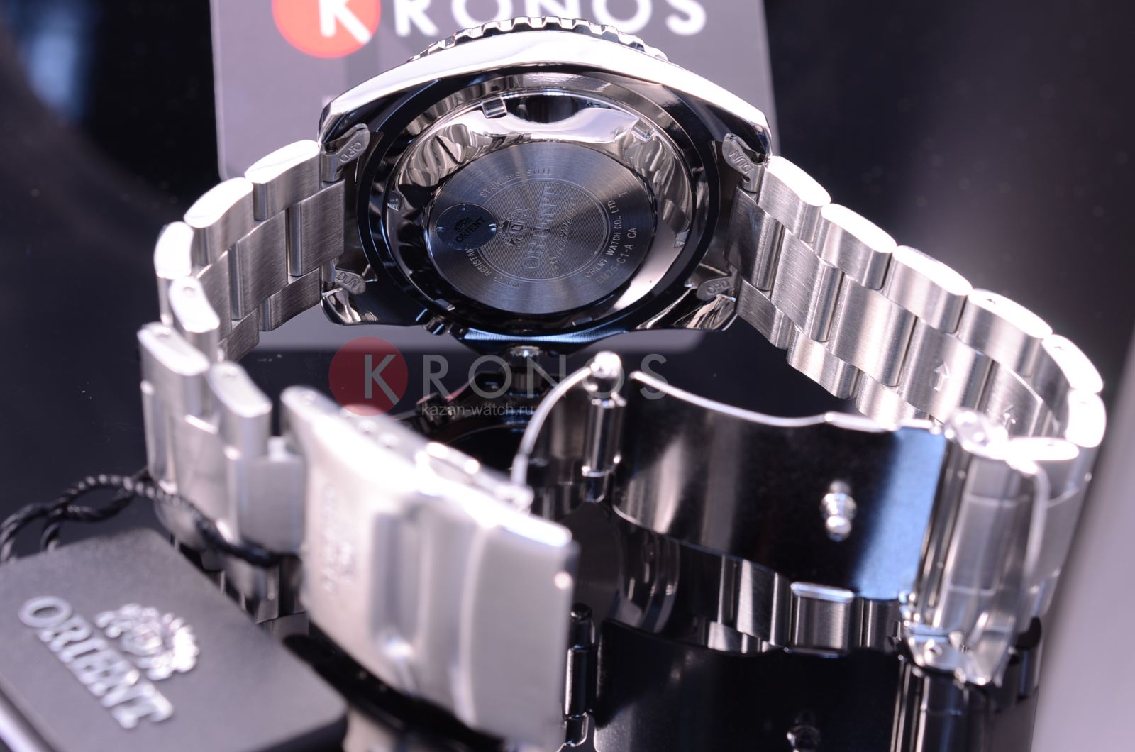 Наручные часы оснащены японским автоматическим механизмом Orient 46943, отличающимся запасом хода на 40 часов. Привлекательно смотрится крупный вращающийся безельБезельВнешний ободок, закрепляющий стекло. В спортивных часах так называется поворотное кольцо с делениями на циферблате, выполняет роль таймера – замеряет отрезки времени на шкале. Неподвижный безель – элемент декора. Однонаправленно вращающийся безель на дайверских часах позволяет фиксировать моменты погружения и выныривания на поверхность.. Среди особенностей модели выделяют завинчивающуюся заднюю крышку и заводную головку, люминесцентную подсветкуЛюминесцентное покрытиеПозволяет считывать показания времени в темноте. Производители наносят на стрелки, часовые индексы, безель или поверхность циферблата светонакопительный состав, дающий холодное свечение., отображение даты и дня недели, повышенную водостойкость 200 метров.
