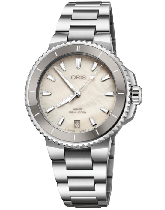 Циферблат модели Aquis Date 36,50 мм отделан мерцающим перламутром кремового цвета, добавляя гламурный шепот роскошным повседневным часам. Его окружает водонепроницаемый корпус из нержавеющей стали и автоматический механизм Swiss Made.