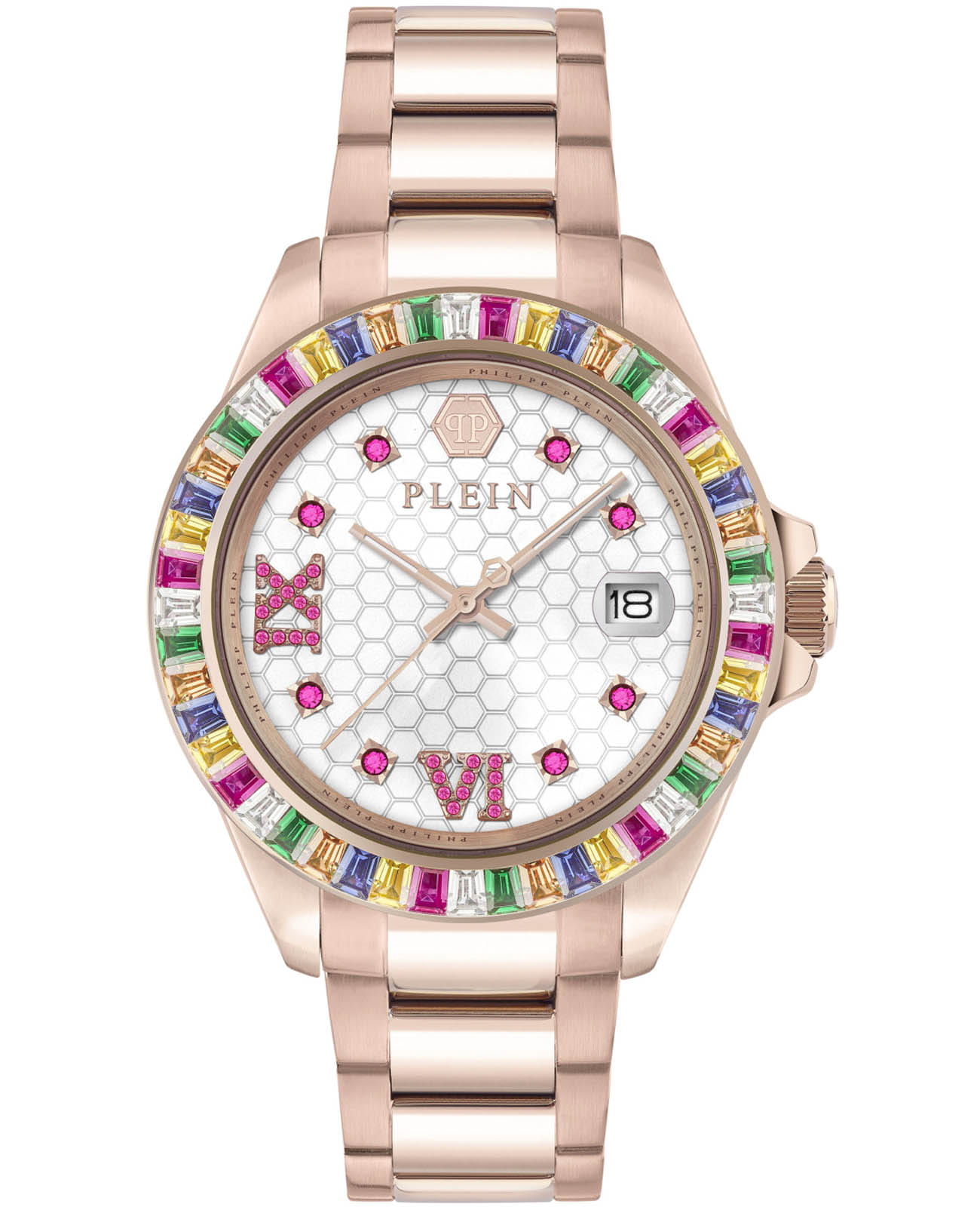 Женские кварцевые часы Philipp Plein Lady Empire PW2FA0425 — это стильное сочетание элегантности и современного дизайна. Изящный корпус выполнен из нержавеющей стали с PVD-покрытиемPVDУльтратонкое покрытие наносится в технике вакуумного напыления, сочетает в себе нитрид титана особой прочности со слоем золота или оксида хрома. Несёт в себе декоративную или защитную функцию. , диаметром 39 мм, что придаст образу женственности и романтизма. Изысканный циферблат с метками в виде точек и римских цифр придает модели особый блеск. Циферблат защищен минеральным стекломМинеральное стеклоМинеральное стекло представляет собой искусственно выращенный минерал кварца. Такое стекло отличается особой устойчивостью к повреждениям и царапинам. Уступает по некоторым качествам сапфировому стеклу., обеспечивающий устойчивость к царапинам и украшен кристаллами. Стрелки с люминесцентным покрытиемЛюминесцентное покрытиеПозволяет считывать показания времени в темноте. Производители наносят на стрелки, часовые индексы, безель или поверхность циферблата светонакопительный состав, дающий холодное свечение.. Окошко даты находится в положении 3 часа. БезельБезельВнешний ободок, закрепляющий стекло. В спортивных часах так называется поворотное кольцо с делениями на циферблате, выполняет роль таймера – замеряет отрезки времени на шкале. Неподвижный безель – элемент декора. Однонаправленно вращающийся безель на дайверских часах позволяет фиксировать моменты погружения и выныривания на поверхность. украшен цирконами. Часы оснащены надежным кварцевым механизмом. Стальной браслет с PVD-покрытиемPVDУльтратонкое покрытие наносится в технике вакуумного напыления, сочетает в себе нитрид титана особой прочности со слоем золота или оксида хрома. Несёт в себе декоративную или защитную функцию. на застёжке-бабочке с кнопкамиЗастёжка "бабочка"Такой вид застёжки дополняется предохранителями, помогающими избежать случайного раскрытия браслета. Обладают изящным исполнением. , гарантирует комфортное и безопасное ношение. Класс водозащиты: 50 метров позволит защитить корпус от случайных брызг или капель дождя. Phlipp Plein — отличный выбор для тех, кто ценит яркость и качество.