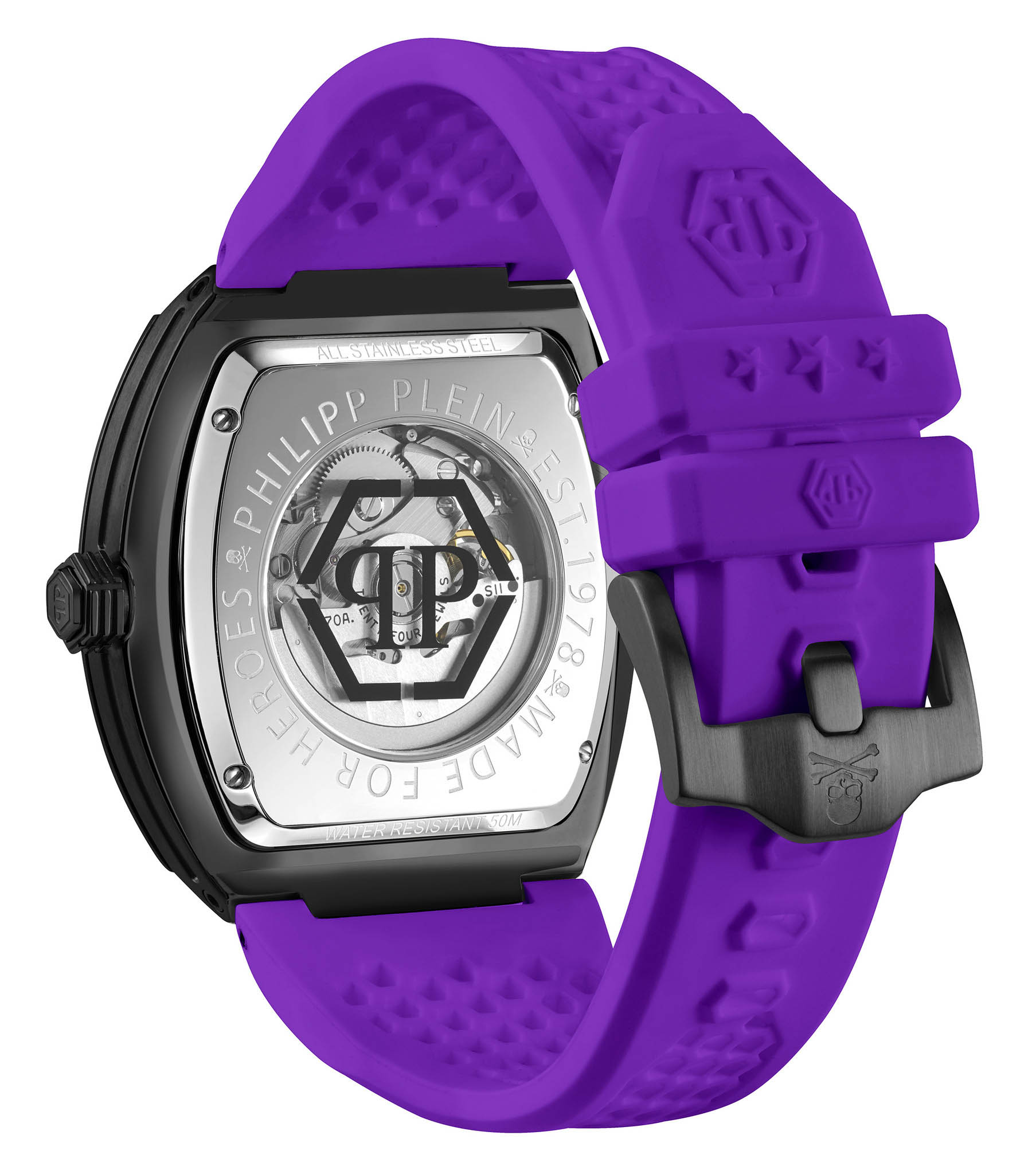 Яркие мужские часы с минеральным стекломМинеральное стеклоМинеральное стекло представляет собой искусственно выращенный минерал кварца. Такое стекло отличается особой устойчивостью к повреждениям и царапинам. Уступает по некоторым качествам сапфировому стеклу. Philipp Plein The Skeleton PWBAA0922, с автоматическим механизмом высокой точности. Класс водозащиты: 50 метров, позволит защитить корпус от случайных брызг или капель дождя. Корпус часов изготовлен из стали с IP-покрытиемIP-покрытиеМетод ионного напыления. Демонстрирует повышенную устойчивость к истиранию, окислению и химическим веществам. Под воздействием высокого давления и температуры около 1500°C молекулы металла надёжно соединяются с частицами корпуса часов..