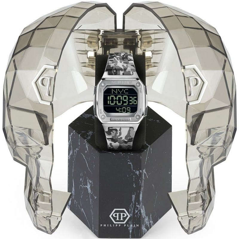 Электронные унисекс часы с секундомеромСекундомерСекундоме́р — прибор, способный измерять интервалы времени с точностью до долей секунды. Philipp Plein Hyper Shock PWHAA1522, электронный механизм с высокой точностью. Класс водозащиты: 50 метров, позволит защитить корпус от случайных брызг или капель дождя. Прямоугольный корпус выполнен из нержавеющей стали. Силиконовый ремешок цвета камуфляж (бело-серый) шириной 22 мм, стандартная застежка.