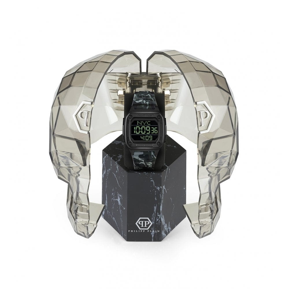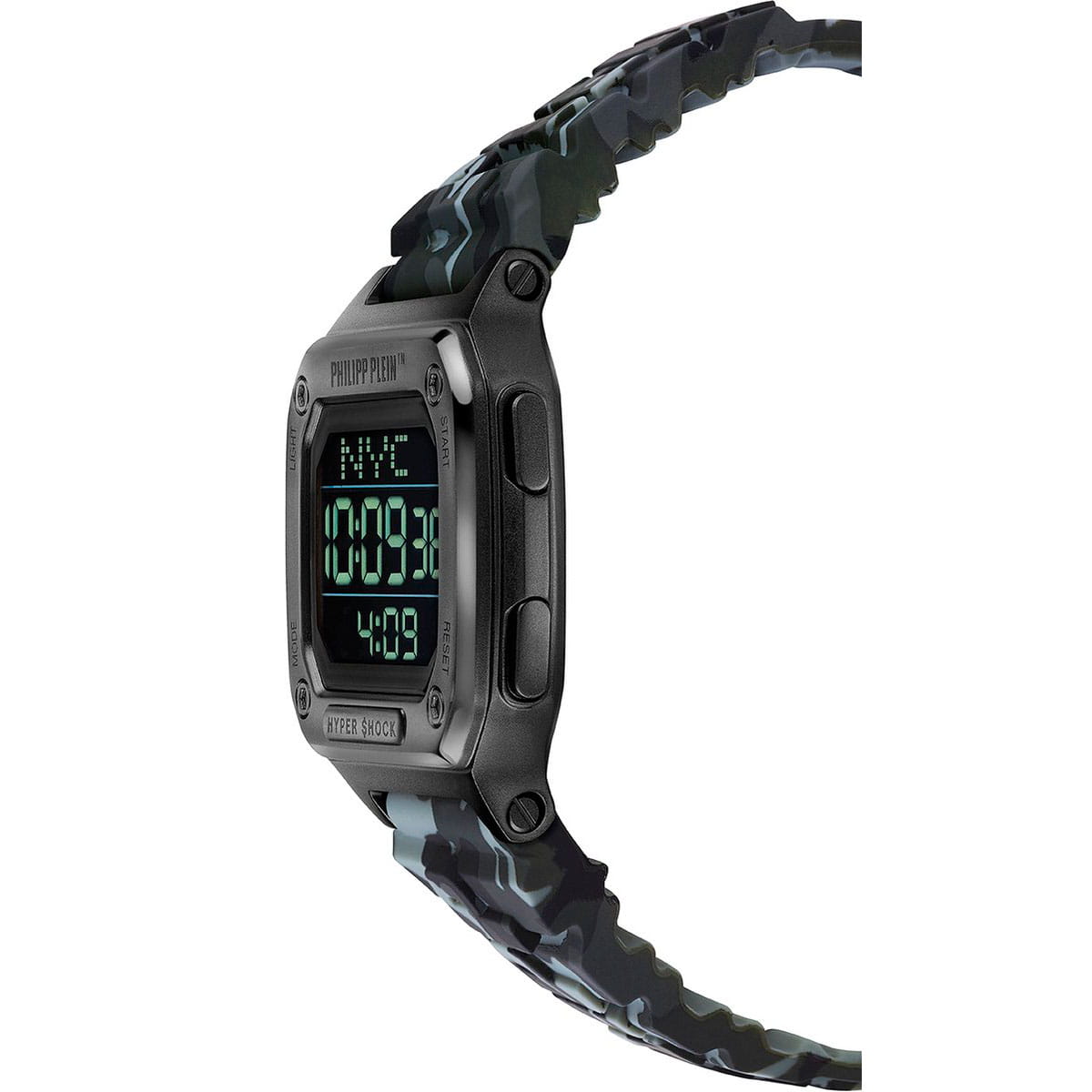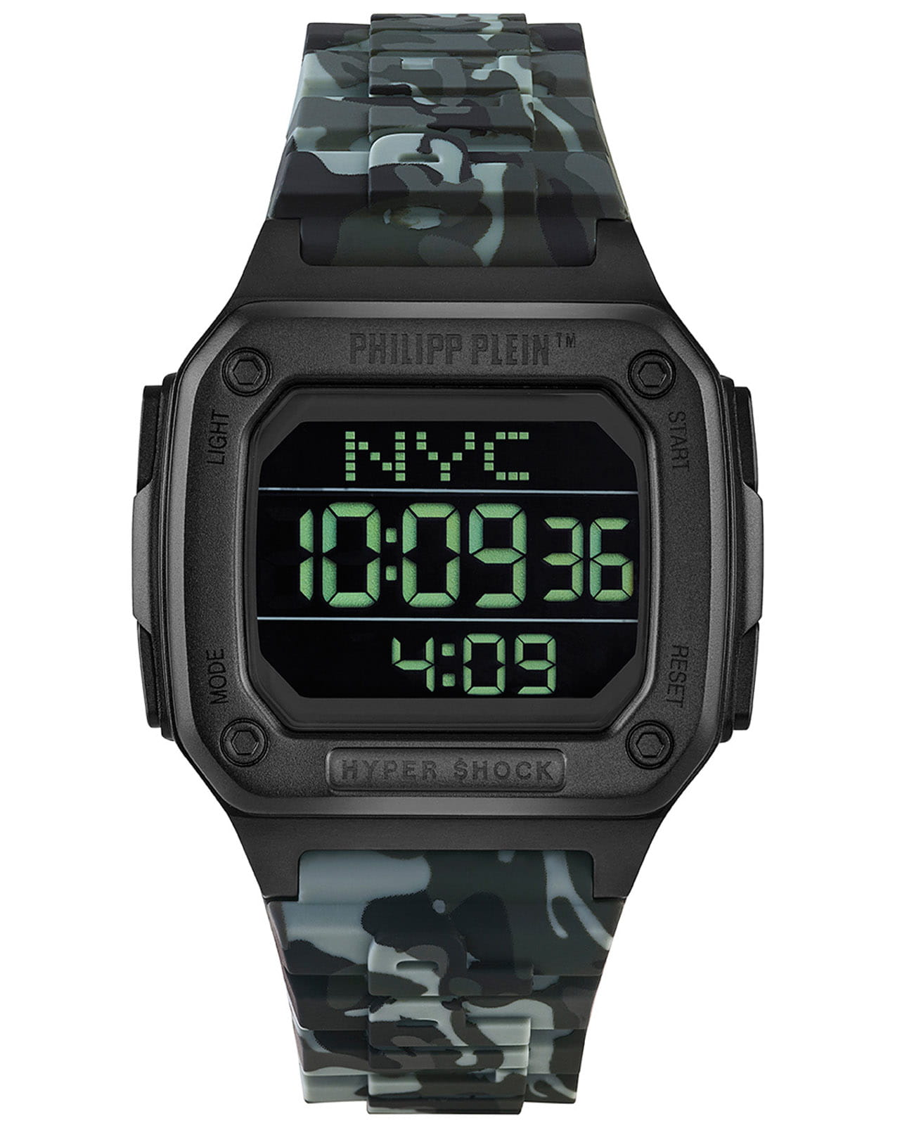 Электронные унисекс часы с секундомеромСекундомерСекундоме́р — прибор, способный измерять интервалы времени с точностью до долей секунды. Philipp Plein Hyper Shock PWHAA1822, электронный механизм с высокой точностью. Класс водозащиты: 50 метров, позволит защитить корпус от случайных брызг или капель дождя. Прямоугольный корпус выполнен из нержавеющей стали с IP-покрытиемIP-покрытиеМетод ионного напыления. Демонстрирует повышенную устойчивость к истиранию, окислению и химическим веществам. Под воздействием высокого давления и температуры около 1500°C молекулы металла надёжно соединяются с частицами корпуса часов. черного цвета. Силиконовый ремешок цвета камуфляж (голубо-зеленый) шириной 22 мм, стандартная застежка.