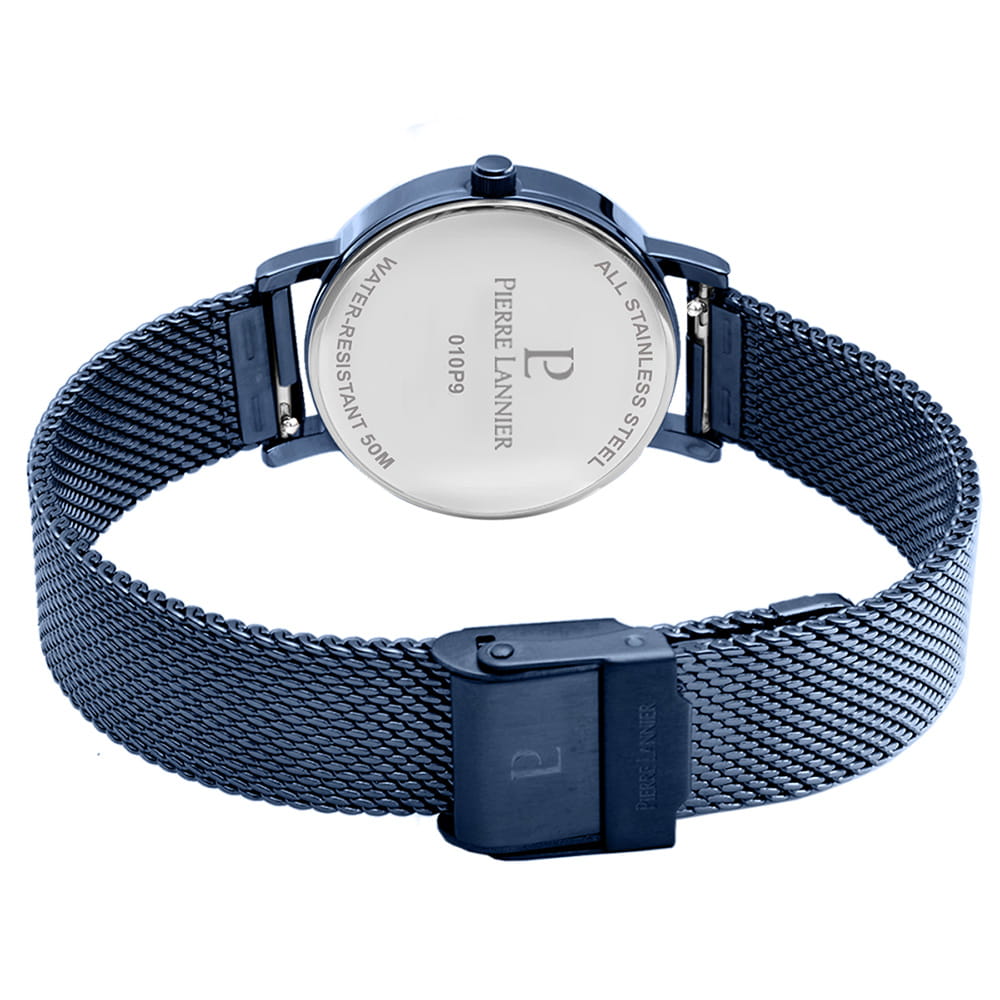 Женские кварцевые часы Pierre Lannier Multiples 010P968. Центральные часовая,минутная и секундная стрелки. Синий циферблат. Круглый корпус выполнен из полированной нержавеющей стали с фактурой по безелюБезельВнешний ободок, закрепляющий стекло. В спортивных часах так называется поворотное кольцо с делениями на циферблате, выполняет роль таймера – замеряет отрезки времени на шкале. Неподвижный безель – элемент декора. Однонаправленно вращающийся безель на дайверских часах позволяет фиксировать моменты погружения и выныривания на поверхность. с IP-покрытиемIP-покрытиеМетод ионного напыления. Демонстрирует повышенную устойчивость к истиранию, окислению и химическим веществам. Под воздействием высокого давления и температуры около 1500°C молекулы металла надёжно соединяются с частицами корпуса часов.. Стальной браслет выполнен в технике миланского плетения, раскладная застёжкаРаскладная застёжкаТакой тип застёжки используется только на браслетах из металла. Она никогда не раскрывается полностью, происходит разделение на 2 и более частей. Раскладывающая застёжка снизит вероятность потери часов к минимуму.. Прочное минеральное стеклоМинеральное стеклоМинеральное стекло представляет собой искусственно выращенный минерал кварца. Такое стекло отличается особой устойчивостью к повреждениям и царапинам. Уступает по некоторым качествам сапфировому стеклу., устойчивое к мелким механическим повреждениям. Водостойкость: 50 метров, позволит защитить корпус от случайных брызг или капель дождя.