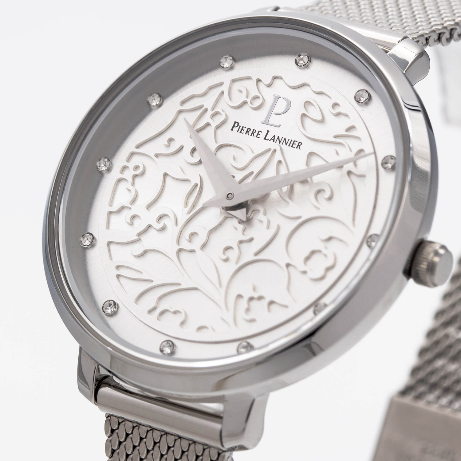 Женские кварцевые часы Pierre Lannier Eolia 040J628. Минеральное стеклоМинеральное стеклоМинеральное стекло представляет собой искусственно выращенный минерал кварца. Такое стекло отличается особой устойчивостью к повреждениям и царапинам. Уступает по некоторым качествам сапфировому стеклу. устойчивое к мелким механическим повреждениям. Центральные часовая и минутная стрелки. Корпус выполнен из нержавеющей стали. Водостойкость: 50 метров, позволит защитить корпус от случайных брызг или капель дождя. Стальной браслет миланского плетения с раскладной застёжкойРаскладная застёжкаТакой тип застёжки используется только на браслетах из металла. Она никогда не раскрывается полностью, происходит разделение на 2 и более частей. Раскладывающая застёжка снизит вероятность потери часов к минимуму.. Серебристый циферблат украшен кристаллами.