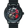 Мужские механические часы с автоподзаводом Pierre Lannier Paddock 385C439. Минеральное стеклоМинеральное стеклоМинеральное стекло представляет собой искусственно выращенный минерал кварца. Такое стекло отличается особой устойчивостью к повреждениям и царапинам. Уступает по некоторым качествам сапфировому стеклу. устойчивое к мелким механическим повреждениям. Центральные часовая, минутная и секундная стрелки. Корпус выполнен из нержавеющей стали с IP-покрытиемIP-покрытиеМетод ионного напыления. Демонстрирует повышенную устойчивость к истиранию, окислению и химическим веществам. Под воздействием высокого давления и температуры около 1500°C молекулы металла надёжно соединяются с частицами корпуса часов.. Водостойкость: 50 метров, позволит защитить корпус от случайных брызг или капель дождя. Стальной браслет миланского плетения с раскладной застёжкойРаскладная застёжкаТакой тип застёжки используется только на браслетах из металла. Она никогда не раскрывается полностью, происходит разделение на 2 и более частей. Раскладывающая застёжка снизит вероятность потери часов к минимуму.. Черный скелетонизированный циферблат. В комплекте черный кожаный ремешок с перфорацией.