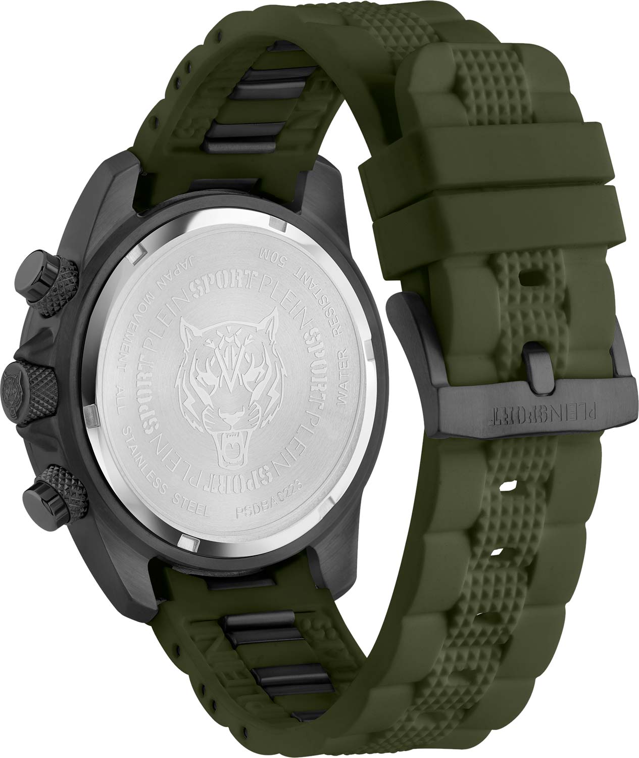 Немецкие кварцевые унисекс часы-хронографХронографФункция позволяет измерять отрезки времени с особой точностью: часы, минуты, секунды. Верным признаком хронографа является наличие на циферблате 3 дополнительных окошек-счётчиков. с секундомеромСекундомерСекундоме́р — прибор, способный измерять интервалы времени с точностью до долей секунды. Plein Sport Hurricane PSDBA0223, кварцевый механизм с высокой точностью. Класс водозащиты: 50 метров, позволит защитить корпус от случайных брызг или капель дождя. Корпус выполнен из стали с IP-покрытиемIP-покрытиеМетод ионного напыления. Демонстрирует повышенную устойчивость к истиранию, окислению и химическим веществам. Под воздействием высокого давления и температуры около 1500°C молекулы металла надёжно соединяются с частицами корпуса часов.. Стрелки и метки с люминесцентным покрытиемЛюминесцентное покрытиеПозволяет считывать показания времени в темноте. Производители наносят на стрелки, часовые индексы, безель или поверхность циферблата светонакопительный состав, дающий холодное свечение.. Силиконовый браслет на стандартной застежке. Минеральное стеклоМинеральное стеклоМинеральное стекло представляет собой искусственно выращенный минерал кварца. Такое стекло отличается особой устойчивостью к повреждениям и царапинам. Уступает по некоторым качествам сапфировому стеклу. устойчивое к мелким механическим повреждениям. Окошко даты находится в положении между 4 и 5 часов.