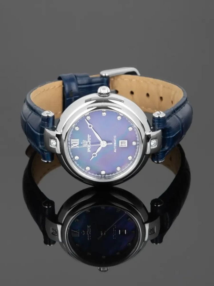 Poljot Maya NH05.671012 — утончённые женские механические часы с автоподзаводом, в которых классическая элегантность сочетается с современным характером. Корпус из нержавеющей стали подчёркивает изящество формы, а глубокий синий циферблат, украшенный кристаллами вместо меток, придаёт модели благородное сияние. Римская цифра XII и аккуратное окно даты на позиции «6 часов» сохраняют баланс и утончённость дизайна. Механизм NH05 SEIKO (Япония) обеспечивает плавный ход стрелок и надёжную работу. Прочное минеральное стеклоМинеральное стеклоМинеральное стекло представляет собой искусственно выращенный минерал кварца. Такое стекло отличается особой устойчивостью к повреждениям и царапинам. Уступает по некоторым качествам сапфировому стеклу. защищает циферблат от повреждений, а ремешок из натуральной кожи тёмно-синего цвета гарантирует комфорт и элегантное прилегание. Poljot — воплощение женственности, точности и утончённого вкуса, созданное для тех, кто ценит механику в изысканном исполнении.