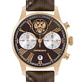 Часы «Президент» модели 3526416 — это мужские кварцевые наручные часы с хронографом, выпущенные ограниченным тиражом в 100 экземпляров. Механизм: японский кварцевый хронограф Miyota 6S21, обеспечивающий высокую точность. Функции: часы, минуты, секунды, дата, хронограф (секундомер). Корпус: из нержавеющей стали с PVD-покрытиемPVDУльтратонкое покрытие наносится в технике вакуумного напыления, сочетает в себе нитрид титана особой прочности со слоем золота или оксида хрома. Несёт в себе декоративную или защитную функцию. цвета жёлтого золота, диаметром 41,8 мм, толщиной 11,4 мм. Циферблат: чёрный с римскими цифрами и изображением государственного герба, подчёркивающий элегантный стиль. Стекло: сапфировое стеклоСапфировое стеклоПрочный и надёжный материал из кристалла сапфира синтетического происхождения, характеризующийся особой твёрдостью и устойчивостью к царапинам и повреждениям. с антибликовым покрытием, устойчивое к царапинам. Водонепроницаемость: 5 ATM (50 метров), что делает часы подходящими для повседневного использования. Ремешок: из натуральной кожи коричневого цвета, шириной 20 мм, с классической застёжкой. Эти часы — идеальный выбор для ценителей стиля и ограниченных коллекций.