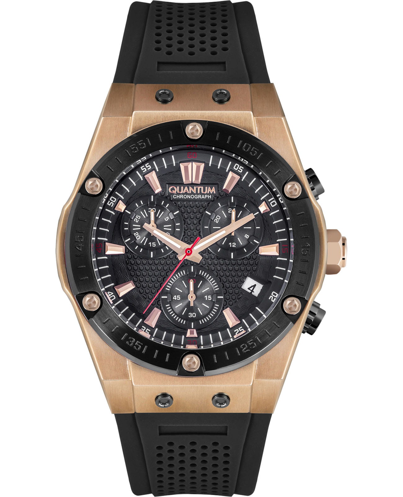 Мужские наручные часы-хронографХронографФункция позволяет измерять отрезки времени с особой точностью: часы, минуты, секунды. Верным признаком хронографа является наличие на циферблате 3 дополнительных окошек-счётчиков. Quantum HNG819.851, кварцевый механизм с высокой точностью. Минеральное стеклоМинеральное стеклоМинеральное стекло представляет собой искусственно выращенный минерал кварца. Такое стекло отличается особой устойчивостью к повреждениям и царапинам. Уступает по некоторым качествам сапфировому стеклу. устойчивое к появлению царапин, обладающее высокой прозрачностью. Класс водозащиты: 50 метров, позволит защитить корпус от случайных брызг или капель дождя. Стрелки с люминесцентным покрытиемЛюминесцентное покрытиеПозволяет считывать показания времени в темноте. Производители наносят на стрелки, часовые индексы, безель или поверхность циферблата светонакопительный состав, дающий холодное свечение.. Корпус часов изготовлен из стали с IP-покрытиемIP-покрытиеМетод ионного напыления. Демонстрирует повышенную устойчивость к истиранию, окислению и химическим веществам. Под воздействием высокого давления и температуры около 1500°C молекулы металла надёжно соединяются с частицами корпуса часов.. Силиконовый ремешок.