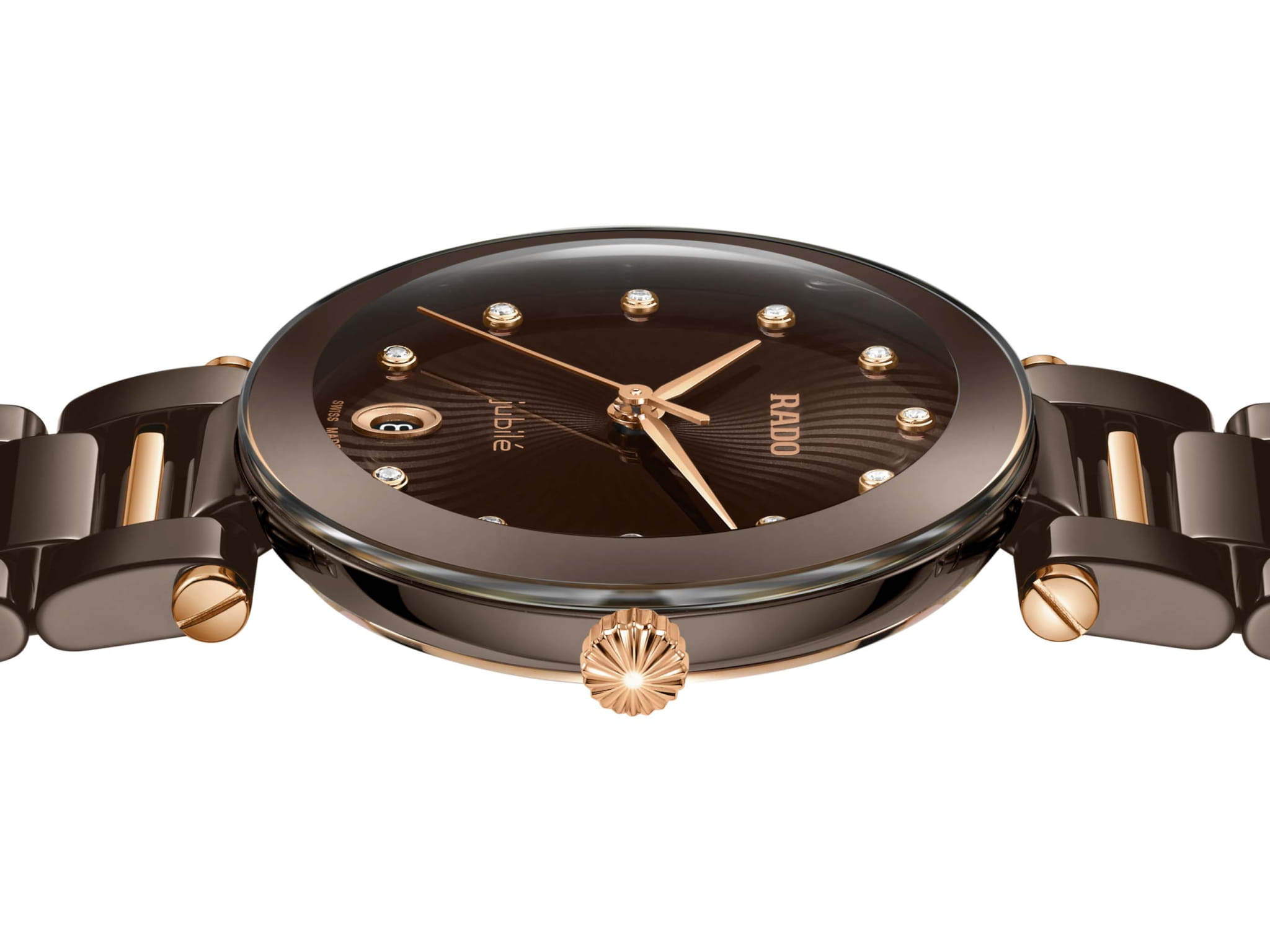 Женские кварцевые часы Rado — это изысканный аксессуар с современным дизайном. Корпус диаметром 31 мм выполнен из высокотехнологичной керамикиВысокотехнологичная керамикаИнновационный запатентованный Rado материал с гладкой или матовой поверхностью. Керамика за счёт кристаллической структуры обладает повышенной устойчивостью от возникновения царапин. Материал способен принимать температуру тела человека, обеспечивая невероятный комфорт при ношении. и нержавеющей стали с PVD-покрытиемPVDУльтратонкое покрытие наносится в технике вакуумного напыления, сочетает в себе нитрид титана особой прочности со слоем золота или оксида хрома. Несёт в себе декоративную или защитную функцию. розового золота. Циферблат коричневого цвета оформлен аналоговым дисплеем. Циферблат защищён выпуклым сапфировым стекломСапфировое стеклоПрочный и надёжный материал из кристалла сапфира синтетического происхождения, характеризующийся особой твёрдостью и устойчивостью к царапинам и повреждениям.. Окошко даты расположено в положении 3 часов. Механизм — кварцевый. Часы оснащены браслетом из комбинации керамики и стали с PVD-покрытиемPVDУльтратонкое покрытие наносится в технике вакуумного напыления, сочетает в себе нитрид титана особой прочности со слоем золота или оксида хрома. Несёт в себе декоративную или защитную функцию. и застёжкой «бабочка» с кнопкамиЗастёжка "бабочка"Такой вид застёжки дополняется предохранителями, помогающими избежать случайного раскрытия браслета. Обладают изящным исполнением. . Водонепроницаемость 50 м позволяет использовать часы в повседневных условиях. Гарантия — 5 лет на механизм, 2 года на изделие. Идеальный выбор для тех, кто ценит стиль, качество и универсальность.