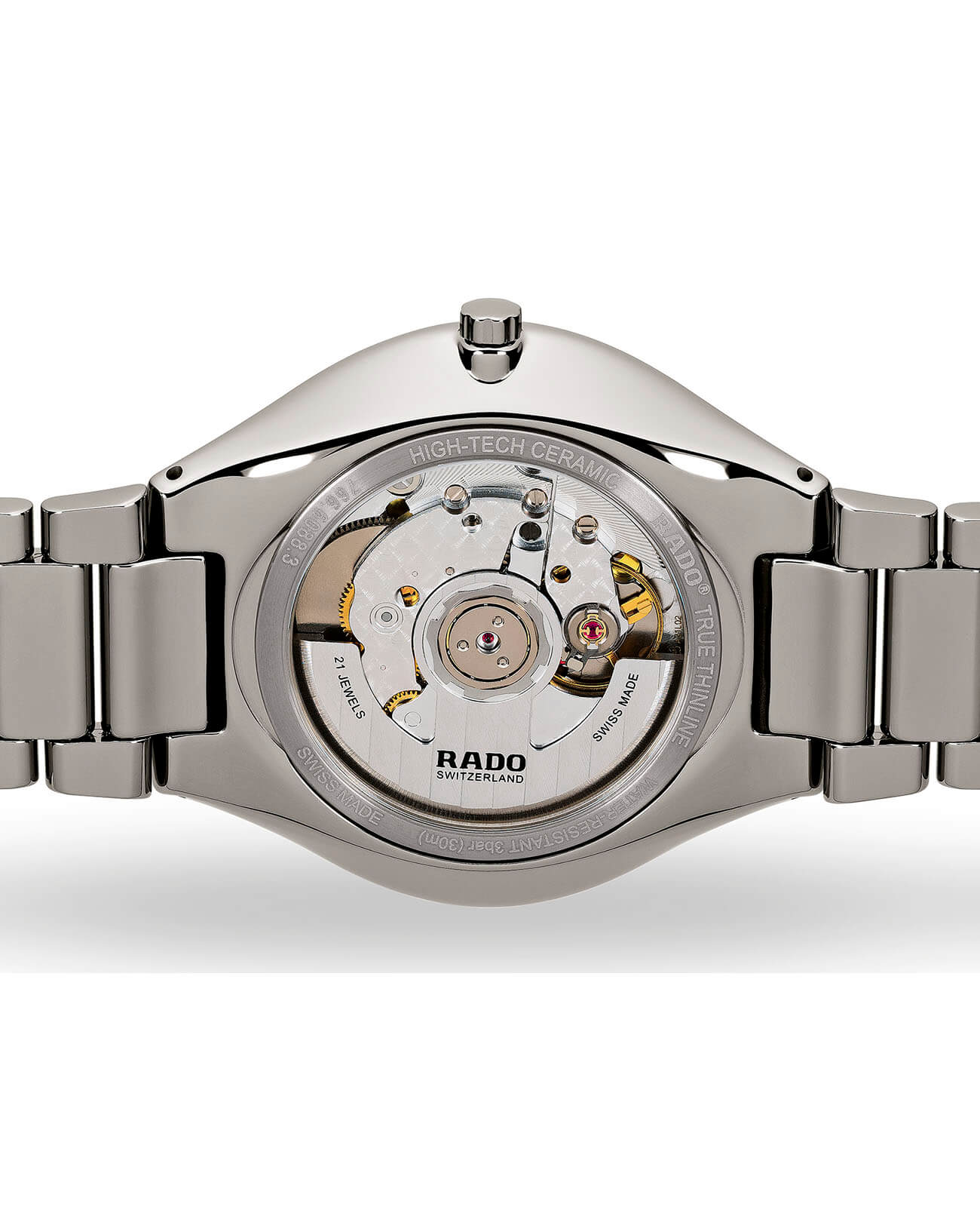 Швейцарские механические часы с автоподзаводом Rado True Thinline Automatic R27088202. Сапфировое стеклоСапфировое стеклоПрочный и надёжный материал из кристалла сапфира синтетического происхождения, характеризующийся особой твёрдостью и устойчивостью к царапинам и повреждениям. устойчивое к мелким механическим повреждениям. Корпус часов из высокотехнологичной плазменной керамикиВысокотехнологичная плазменная керамикаИнновационный материал, технология запатентована. Выплавление керамики осуществляется в печи при 20 000 °C, белоснежный материал под воздействием ультравысокой температуры приобретает уникальный блеск, присущий металлам.. Класс водозащиты: 30 метров, позволит защитить корпус от случайных брызг или капель дождя. Браслет из высокотехнологичной плазменной керамикиВысокотехнологичная плазменная керамикаИнновационный материал, технология запатентована. Выплавление керамики осуществляется в печи при 20 000 °C, белоснежный материал под воздействием ультравысокой температуры приобретает уникальный блеск, присущий металлам.на застёжке-бабочкеЗастёжка "бабочка"Такой вид застёжки дополняется предохранителями, помогающими избежать случайного раскрытия браслета. Обладают изящным исполнением. .