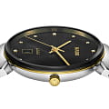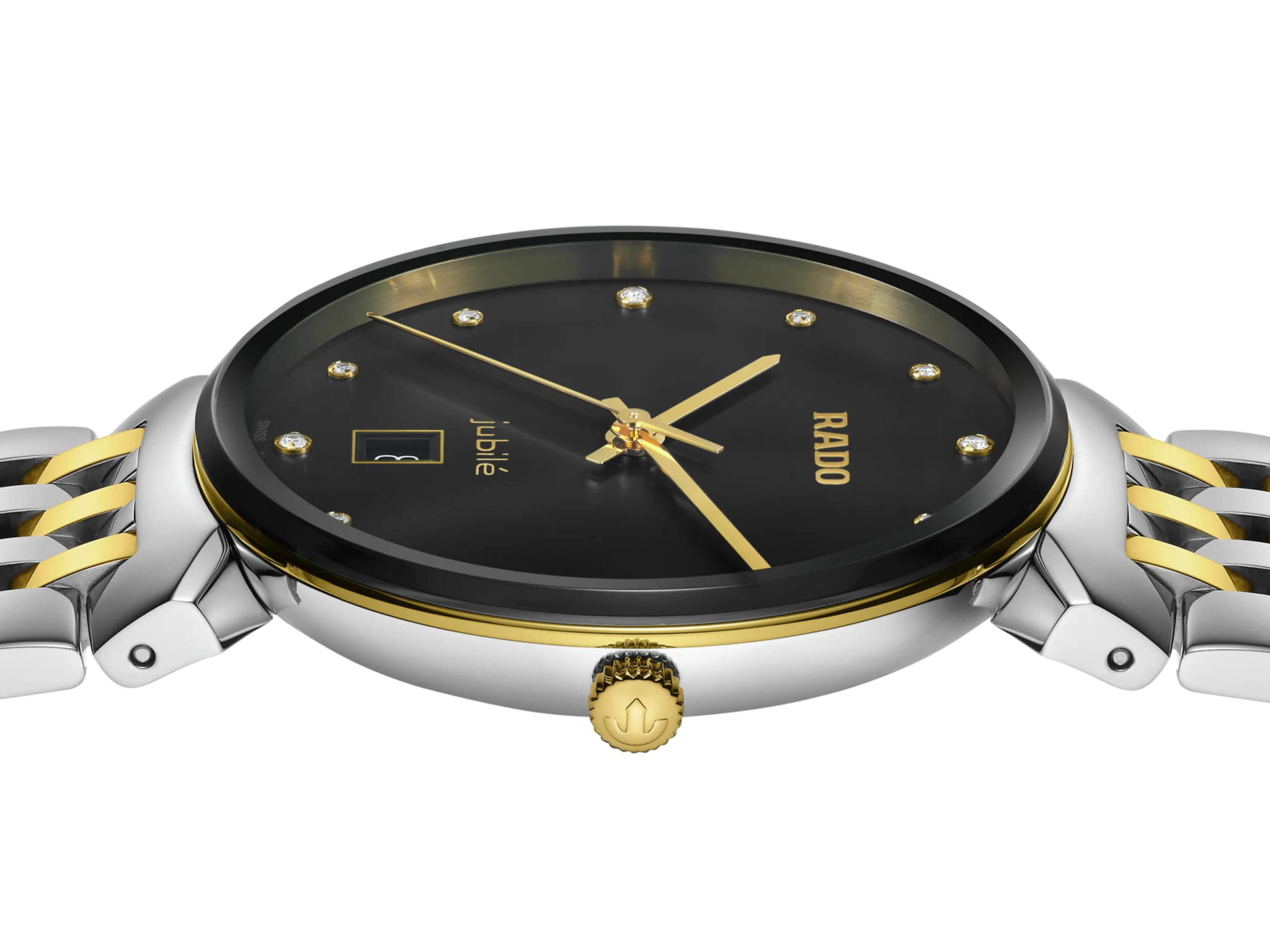 Швейцарские кварцевые часы Rado Florence Classic Diamonds R48912743. Сапфировое стеклоСапфировое стеклоПрочный и надёжный материал из кристалла сапфира синтетического происхождения, характеризующийся особой твёрдостью и устойчивостью к царапинам и повреждениям. устойчивое к мелким механическим повреждениям. Корпус изготовлен из нержавеющей стали с частичным PVD-покрытиемPVDУльтратонкое покрытие наносится в технике вакуумного напыления, сочетает в себе нитрид титана особой прочности со слоем золота или оксида хрома. Несёт в себе декоративную или защитную функцию.. БезельБезельВнешний ободок, закрепляющий стекло. В спортивных часах так называется поворотное кольцо с делениями на циферблате, выполняет роль таймера – замеряет отрезки времени на шкале. Неподвижный безель – элемент декора. Однонаправленно вращающийся безель на дайверских часах позволяет фиксировать моменты погружения и выныривания на поверхность. с PVD-покрытиемPVDУльтратонкое покрытие наносится в технике вакуумного напыления, сочетает в себе нитрид титана особой прочности со слоем золота или оксида хрома. Несёт в себе декоративную или защитную функцию.. Циферблат украшен бриллиантами. Окошко даты находится в положении 6 часов. Класс водозащиты: 50 метров, позволит защитить корпус от случайных брызг или капель дождя. Браслет из стали с частичным PVD-покрытиемPVDУльтратонкое покрытие наносится в технике вакуумного напыления, сочетает в себе нитрид титана особой прочности со слоем золота или оксида хрома. Несёт в себе декоративную или защитную функцию. на застёжке-бабочкеЗастёжка "бабочка"Такой вид застёжки дополняется предохранителями, помогающими избежать случайного раскрытия браслета. Обладают изящным исполнением. .