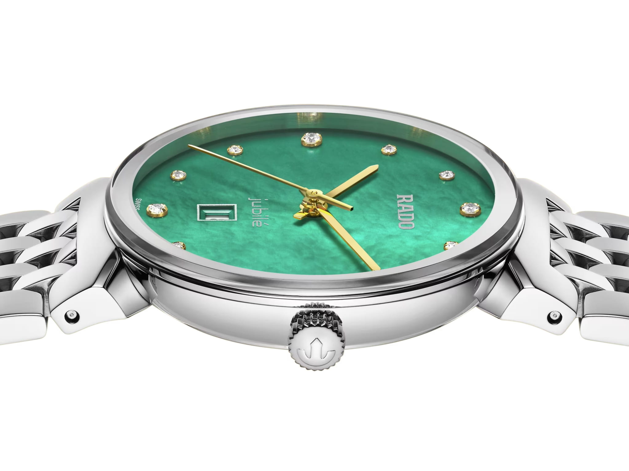 Швейцарские женские наручные часы с надёжным кварцевым механизмом Rado Florence Diamonds R48913903. Корпус и браслет часов изготовлены из нержавеющей стали. Сапфировое стеклоСапфировое стеклоПрочный и надёжный материал из кристалла сапфира синтетического происхождения, характеризующийся особой твёрдостью и устойчивостью к царапинам и повреждениям. с антибликовым покрытиемАнтибликовое покрытиеСлой оксида металла в 0,13-0,3 микрон, благодаря которому стекло часов не бликует и не отражает свет. Антибликовое покрытие уменьшает отражение света в 10 раз, обеспечивая отличную читаемость показателей циферблата., устойчивое к мелким механическим повреждениям. Стальной браслет на застёжке-бабочке с кнопкамиЗастёжка "бабочка"Такой вид застёжки дополняется предохранителями, помогающими избежать случайного раскрытия браслета. Обладают изящным исполнением. . Класс водозащиты: 50 метров, позволит защитить корпус от случайных брызг или капель дождя. Окошко даты находится в положении 6 часов.. Циферблат инкрустирован бриллиантами.