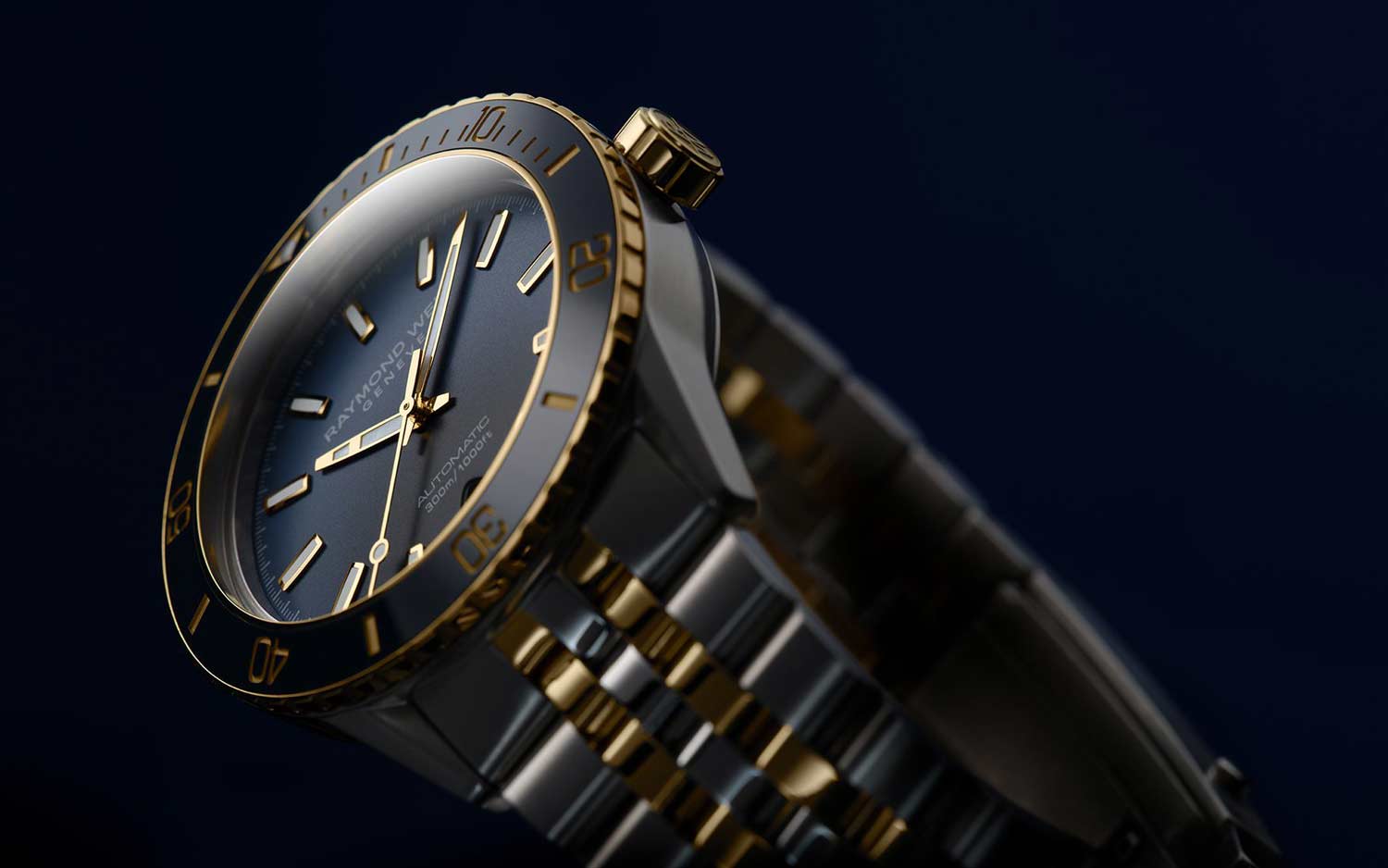 Высококачественные дайверские часы Raymond Weil Freelancer 2775-SP3-50051 с автоподзаводом — это элегантный аксессуар, сочетающий швейцарское качество и современный дизайн. Корпус диаметром 42 мм выполнен из нержавеющей стали, что придаёт часам стильный и долговечный вид. Темно-синий циферблат оснащён стрелками и часовыми метками с люминесцентным покрытиемЛюминесцентное покрытиеПозволяет считывать показания времени в темноте. Производители наносят на стрелки, часовые индексы, безель или поверхность циферблата светонакопительный состав, дающий холодное свечение., что обеспечивает отличную читаемость в любых условиях освещения. Окно даты на отметке 6 часов добавляет удобства в повседневной жизни. Вращающийся в одном направлении синий керамический безельБезельВнешний ободок, закрепляющий стекло. В спортивных часах так называется поворотное кольцо с делениями на циферблате, выполняет роль таймера – замеряет отрезки времени на шкале. Неподвижный безель – элемент декора. Однонаправленно вращающийся безель на дайверских часах позволяет фиксировать моменты погружения и выныривания на поверхность. с золотистой гравировкой.