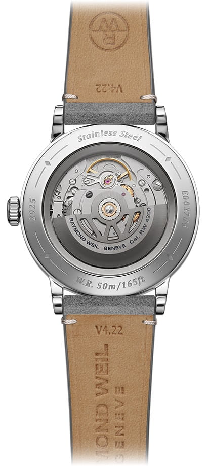 Raymond Weil Millesime — мужские автоматические часы для ценителей элегантности и швейцарского мастерства. Идеальное сочетание утончённого дизайна и функциональности для динамичного образа жизни. Ключевые особенности: Швейцарский автоматический механизм с запасом хода 38 часов и W-образным ротором, демонстрирующимся через сапфировое стеклоСапфировое стеклоПрочный и надёжный материал из кристалла сапфира синтетического происхождения, характеризующийся особой твёрдостью и устойчивостью к царапинам и повреждениям. на задней крышке. Циферблат с метками в виде штрихов, выполненный в лаконичном стиле, защищён сапфировым стекломСапфировое стеклоПрочный и надёжный материал из кристалла сапфира синтетического происхождения, характеризующийся особой твёрдостью и устойчивостью к царапинам и повреждениям., устойчивым к царапинам и ударам. Эргономичная заводная головка с гравировкой логотипа RW подчеркивает внимание к деталям. Кожаный ремешок с классической застёжкой обеспечивает комфорт и универсальность ношения. Дизайн и детали: Строгий круглый корпус из с минималистичными линиями и полированной отделкой. Прозрачная задняя крышка с (сапфировым стекломСапфировое стеклоПрочный и надёжный материал из кристалла сапфира синтетического происхождения, характеризующийся особой твёрдостью и устойчивостью к царапинам и повреждениям.) позволяет наблюдать за работой механизма. Тонкий профиль и сдержанная цветовая гамма делают часы уместными как с деловым костюмом, так и с повседневной одеждой. Raymond Weil Millesime — это воплощение швейцарской точности и изысканной простоты. Часы для тех, кто ценит надёжность, элегантность и безупречный стиль.