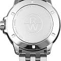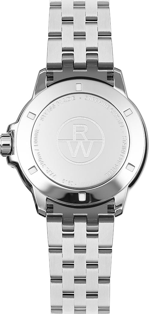 Модель оснащена фирменным безелемБезельВнешний ободок, закрепляющий стекло. В спортивных часах так называется поворотное кольцо с делениями на циферблате, выполняет роль таймера – замеряет отрезки времени на шкале. Неподвижный безель – элемент декора. Однонаправленно вращающийся безель на дайверских часах позволяет фиксировать моменты погружения и выныривания на поверхность. с шестью декоративными винтами и завинчивающейся заводной головкой с защитой и логотипом RW. Завинчивающаяся задняя крышка и стальной браслет на раскладной застёжкеРаскладная застёжкаТакой тип застёжки используется только на браслетах из металла. Она никогда не раскрывается полностью, происходит разделение на 2 и более частей. Раскладывающая застёжка снизит вероятность потери часов к минимуму. с двойной системой защиты добавляет уверенности в использовании.