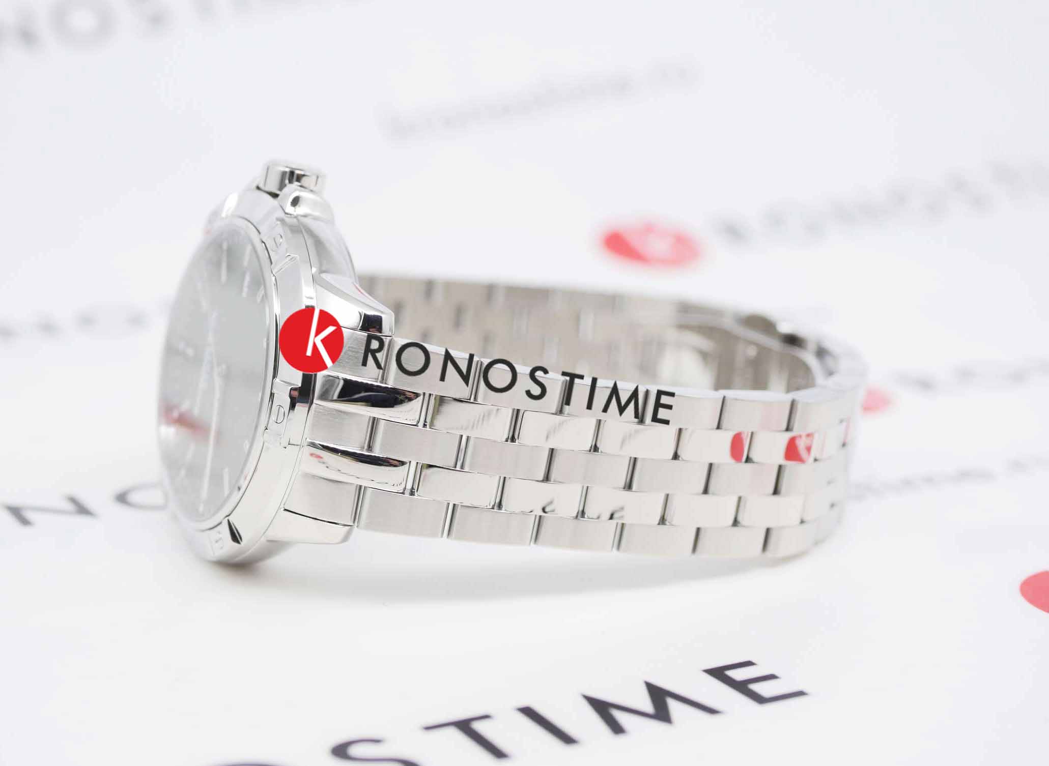 Циферблат с метками в виде штрихов покрыт прочным сапфировым стекломСапфировое стеклоПрочный и надёжный материал из кристалла сапфира синтетического происхождения, характеризующийся особой твёрдостью и устойчивостью к царапинам и повреждениям., которое защищает часы от царапин.