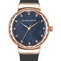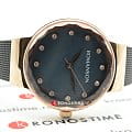 Оригинальный дизайн разрабатывался лично Вольфгангом Джонсоном, синий перламутровый циферблат дополнен фигурным безелемБезельВнешний ободок, закрепляющий стекло. В спортивных часах так называется поворотное кольцо с делениями на циферблате, выполняет роль таймера – замеряет отрезки времени на шкале. Неподвижный безель – элемент декора. Однонаправленно вращающийся безель на дайверских часах позволяет фиксировать моменты погружения и выныривания на поверхность.. В качестве декорирующего элемента используются 12 цирконов, сияние которых сразу вызывает праздничное настроение. Стальной браслет отличается модным миланским плетением. Кварцевый высокоточный механизм. Граненное минеральное стекло. Износоустойчивое PVD-покрытиеPVDУльтратонкое покрытие наносится в технике вакуумного напыления, сочетает в себе нитрид титана особой прочности со слоем золота или оксида хрома. Несёт в себе декоративную или защитную функцию.. Водонепроницаемость до 3 бар. Диаметр корпуса: 32 мм.