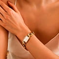 Модель оснащена кварцевым механизмом, обеспечивающим точное измерение времени. Металлический браслет с плоскими звеньями и PVD-покрытиемPVDУльтратонкое покрытие наносится в технике вакуумного напыления, сочетает в себе нитрид титана особой прочности со слоем золота или оксида хрома. Несёт в себе декоративную или защитную функцию. золотистого цвета дополнен застёжкой типа "Т-бар" с гравировкой Rosefield, длина регулируется от 138 до 185 мм для комфортного ношения и надёжной фиксации.