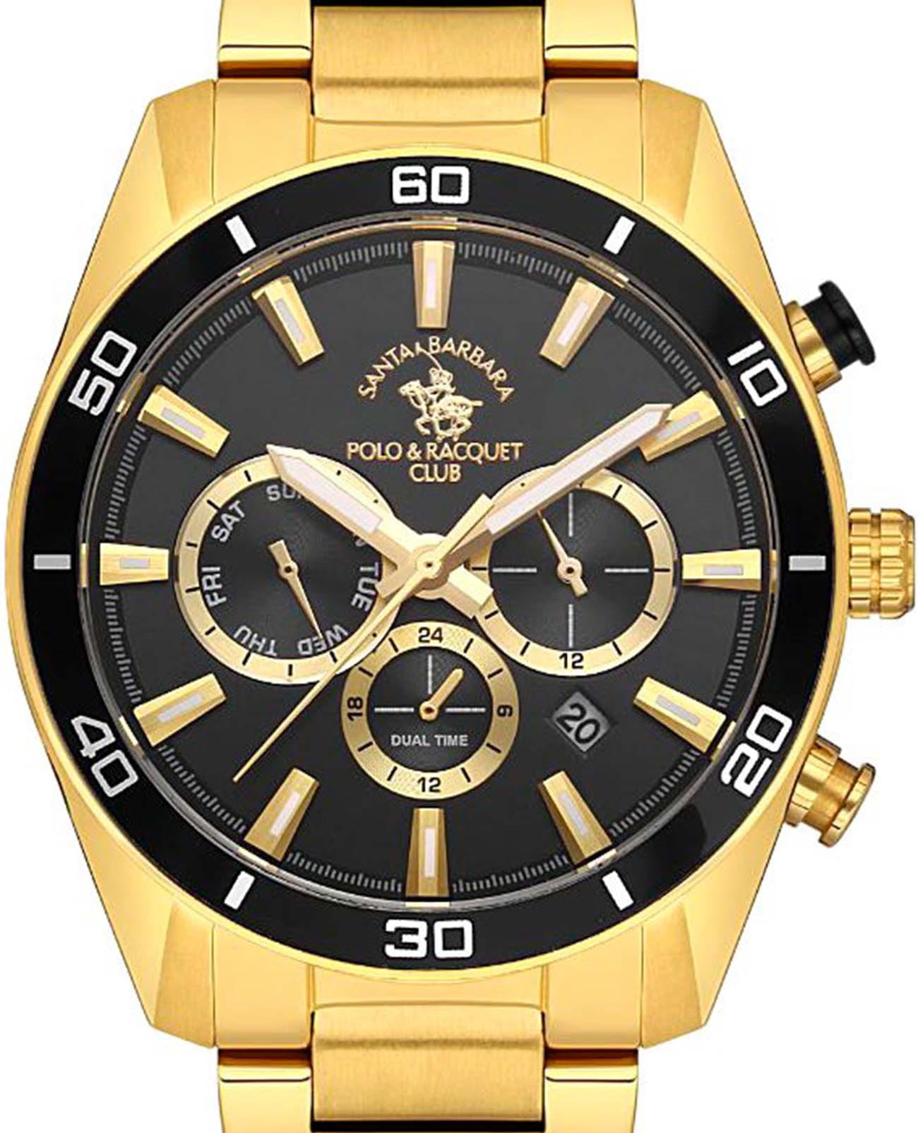 Мужские кварцевые часы Santa Barbara Polo & Racquet Club — это выразительный и функциональный аксессуар. Корпус диаметром 44 мм и высотой 51,5 мм выполнен из стали с IP-покрытиемIP-покрытиеМетод ионного напыления. Демонстрирует повышенную устойчивость к истиранию, окислению и химическим веществам. Под воздействием высокого давления и температуры около 1500°C молекулы металла надёжно соединяются с частицами корпуса часов.. БезельБезельВнешний ободок, закрепляющий стекло. В спортивных часах так называется поворотное кольцо с делениями на циферблате, выполняет роль таймера – замеряет отрезки времени на шкале. Неподвижный безель – элемент декора. Однонаправленно вращающийся безель на дайверских часах позволяет фиксировать моменты погружения и выныривания на поверхность. с минутной шкалой придаёт изделию спортивный характер. Циферблат чёрного цвета оформлен по технологии Sunray («солнечные лучи»), дополнен накладными метками в виде штрихов и фирменным логотипом. Окошко даты расположено между 4 и 5 часами. Указатель дня недели и второй часовой пояс вынесены на отдельные субциферблаты, также присутствует индикация 24-часового формата времени. Стрелки и метки с люминесцентным покрытиемЛюминесцентное покрытиеПозволяет считывать показания времени в темноте. Производители наносят на стрелки, часовые индексы, безель или поверхность циферблата светонакопительный состав, дающий холодное свечение., обеспечивающим хорошую читаемость в темноте. Циферблат защищён минеральным стекломМинеральное стеклоМинеральное стекло представляет собой искусственно выращенный минерал кварца. Такое стекло отличается особой устойчивостью к повреждениям и царапинам. Уступает по некоторым качествам сапфировому стеклу.. Часы оснащены стальным браслетом с IP-покрытиемIP-покрытиеМетод ионного напыления. Демонстрирует повышенную устойчивость к истиранию, окислению и химическим веществам. Под воздействием высокого давления и температуры около 1500°C молекулы металла надёжно соединяются с частицами корпуса часов. и раскладной застёжкойРаскладная застёжкаТакой тип застёжки используется только на браслетах из металла. Она никогда не раскрывается полностью, происходит разделение на 2 и более частей. Раскладывающая застёжка снизит вероятность потери часов к минимуму.. Идеальный выбор для тех, кто ценит стиль, точность и надёжность.