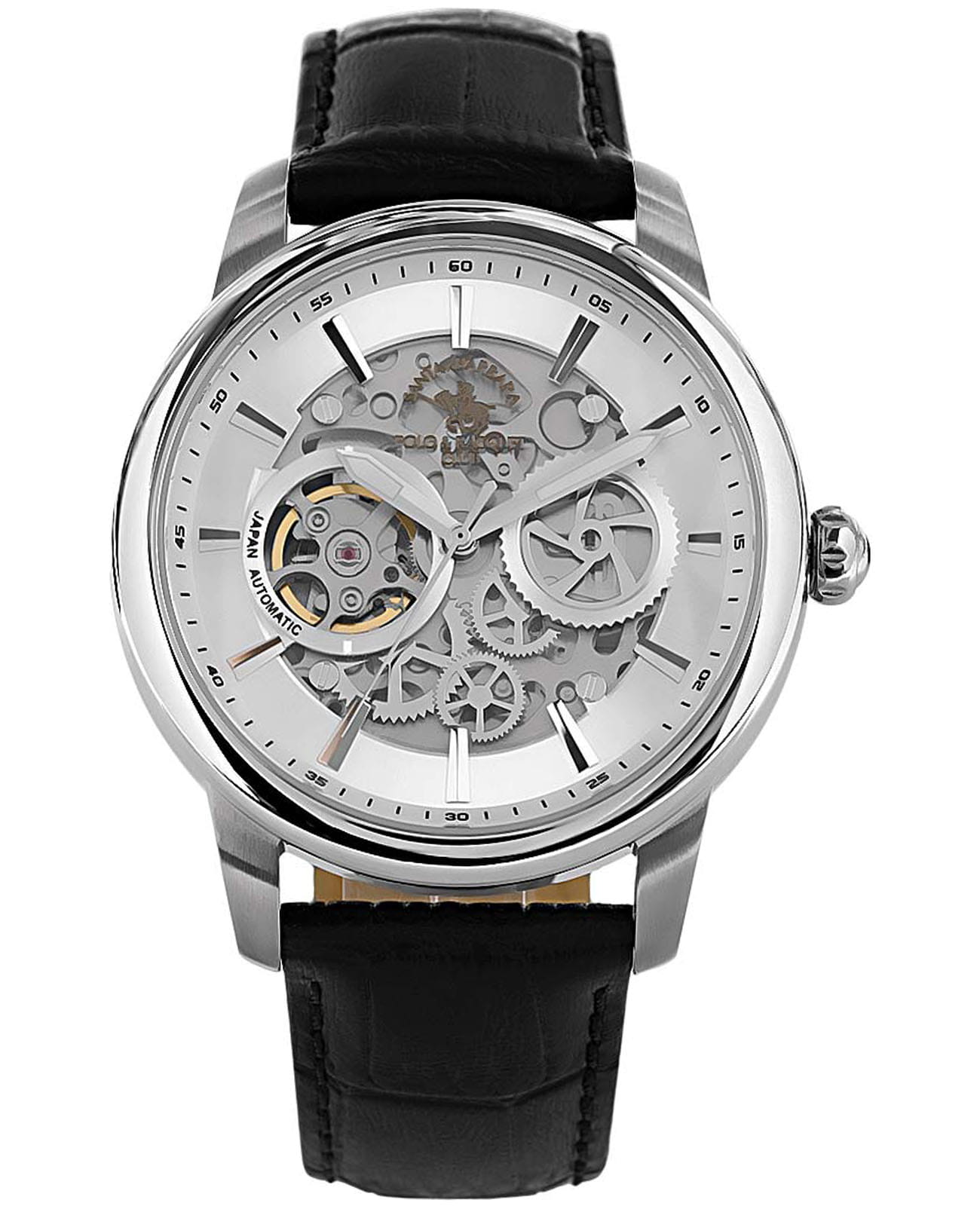 Мужские механические часы с автоподзаводом Santa Barbara Polo & Racquet Club — это демонстрация инженерного искусства и изящества. Корпус диаметром 43,8 мм и высотой 52 мм выполнен из стали. Циферблат серебристого цвета частично скелетонизирован, что позволяет наблюдать за работой механизма. Двухуровневый циферблат оформлен по технологии Sunray («солнечные лучи»), дополнен накладными метками в виде штрихов и фирменным логотипом. Стрелки с люминесцентным покрытиемЛюминесцентное покрытиеПозволяет считывать показания времени в темноте. Производители наносят на стрелки, часовые индексы, безель или поверхность циферблата светонакопительный состав, дающий холодное свечение., обеспечивающим хорошую читаемость в темноте. Циферблат защищён минеральным стекломМинеральное стеклоМинеральное стекло представляет собой искусственно выращенный минерал кварца. Такое стекло отличается особой устойчивостью к повреждениям и царапинам. Уступает по некоторым качествам сапфировому стеклу.. Прозрачная задняя крышка открывает вид на декорированный механизм. Часы оснащены кожаным ремешком с стандартной застёжкой. Водонепроницаемость 50 м позволяет использовать часы в повседневных условиях. Идеальный выбор для тех, кто ценит технологичность, стиль и качество.