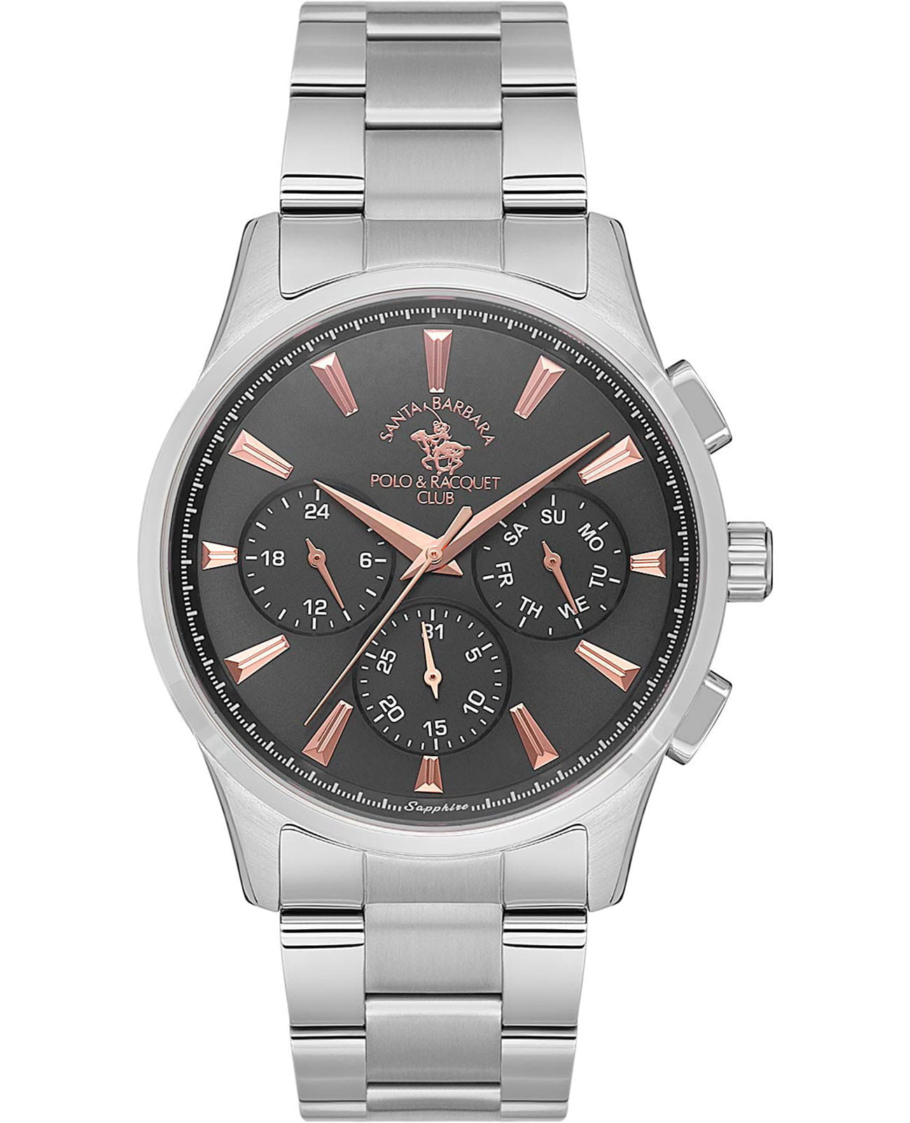 Мужские кварцевые часы Santa Barbara Polo & Racquet Club — это идеальный выбор для тех, кто ценит точность и практичность. Корпус диаметром 42 мм выполнен из нержавеющей стали 316L с матовой и полированной отделкой. Циферблат чёрного цвета оформлен по технологии Sunray («солнечные лучи»), дополнен накладными метками в виде штрихов и фирменным логотипом. Указатели дня недели и даты вынесены на отдельные субциферблаты, также присутствует индикация 24-часового формата времени. Стрелки клиновидной формы, в стиле Dauphine. Циферблат защищён минеральным стекломМинеральное стеклоМинеральное стекло представляет собой искусственно выращенный минерал кварца. Такое стекло отличается особой устойчивостью к повреждениям и царапинам. Уступает по некоторым качествам сапфировому стеклу.. Часы оснащены стальным браслетом с раскладной застёжкойРаскладная застёжкаТакой тип застёжки используется только на браслетах из металла. Она никогда не раскрывается полностью, происходит разделение на 2 и более частей. Раскладывающая застёжка снизит вероятность потери часов к минимуму.. Водонепроницаемость 50 м позволяет использовать часы в повседневных условиях. Идеальный выбор для тех, кто ценит стиль, точность и надёжность.