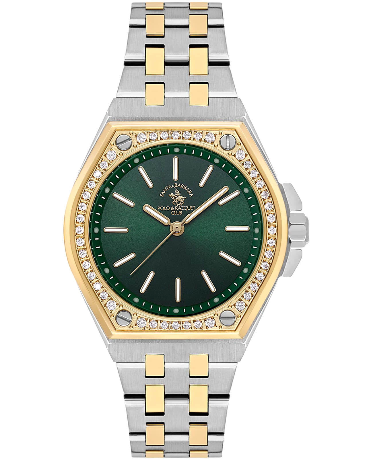 Женские кварцевые Santa Barbara Polo & Racquet Club SB.1.10589-4— воплощение элегантности и технического совершенства. Изысканный корпус из нержавеющей стали, диаметром 36 мм, что делает их устойчивыми к внешним воздействиям и придает благородный вид. Стрелки и метки с люминесцентным покрытиемЛюминесцентное покрытиеПозволяет считывать показания времени в темноте. Производители наносят на стрелки, часовые индексы, безель или поверхность циферблата светонакопительный состав, дающий холодное свечение., обеспечивающим хорошую читаемость в темноте. Изящный циферблат защищён минеральным стекломМинеральное стеклоМинеральное стекло представляет собой искусственно выращенный минерал кварца. Такое стекло отличается особой устойчивостью к повреждениям и царапинам. Уступает по некоторым качествам сапфировому стеклу., устойчивое к царапинам и механическим повреждениям. Браслет из стали с частичным IP-покрытиемIP-покрытиеМетод ионного напыления. Демонстрирует повышенную устойчивость к истиранию, окислению и химическим веществам. Под воздействием высокого давления и температуры около 1500°C молекулы металла надёжно соединяются с частицами корпуса часов. на застёжке-бабочке с кнопкамиЗастёжка "бабочка"Такой вид застёжки дополняется предохранителями, помогающими избежать случайного раскрытия браслета. Обладают изящным исполнением. обеспечивает комфортное и безопасное ношение. Декоративный безельБезельВнешний ободок, закрепляющий стекло. В спортивных часах так называется поворотное кольцо с делениями на циферблате, выполняет роль таймера – замеряет отрезки времени на шкале. Неподвижный безель – элемент декора. Однонаправленно вращающийся безель на дайверских часах позволяет фиксировать моменты погружения и выныривания на поверхность. с IP-покрытиемIP-покрытиеМетод ионного напыления. Демонстрирует повышенную устойчивость к истиранию, окислению и химическим веществам. Под воздействием высокого давления и температуры около 1500°C молекулы металла надёжно соединяются с частицами корпуса часов. золотистого цвета украшен кристаллами. Водонепроницаемость 50 метров позволит защитить корпус от случайных брызг или капель дождя. Идеальный выбор для тех, кто ценит элегантный дизайн и качество.