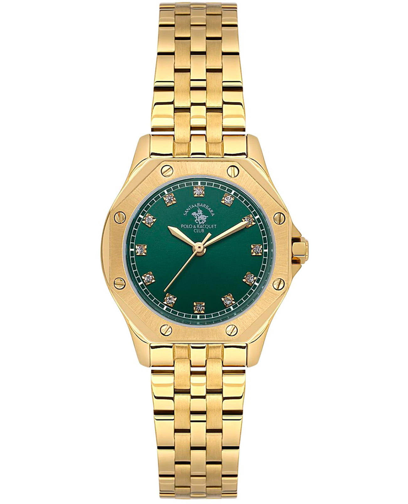 Женские кварцевые часы Santa Barbara Polo & Racquet Club — это изысканный и стильный аксессуар. Корпус диаметром 27 мм выполнен из стали 316L с IP-покрытиемIP-покрытиеМетод ионного напыления. Демонстрирует повышенную устойчивость к истиранию, окислению и химическим веществам. Под воздействием высокого давления и температуры около 1500°C молекулы металла надёжно соединяются с частицами корпуса часов.. БезельБезельВнешний ободок, закрепляющий стекло. В спортивных часах так называется поворотное кольцо с делениями на циферблате, выполняет роль таймера – замеряет отрезки времени на шкале. Неподвижный безель – элемент декора. Однонаправленно вращающийся безель на дайверских часах позволяет фиксировать моменты погружения и выныривания на поверхность. накладной, с матовой обработкой и декоративными болтами. Циферблат зелёного цвета выполнен по технологии Sunray («солнечные лучи») и оформлен точками, инкрустированными кристаллами, и мечевидными стрелками в стиле Sword. Циферблат защищён минеральным стекломМинеральное стеклоМинеральное стекло представляет собой искусственно выращенный минерал кварца. Такое стекло отличается особой устойчивостью к повреждениям и царапинам. Уступает по некоторым качествам сапфировому стеклу.. Механизм — японское кварцевое движение калибра Seiko TMI VJ21C1. Заводная головка выполнена в форме болта с защитой. Часы оснащены стальным браслетом с IP-покрытиемIP-покрытиеМетод ионного напыления. Демонстрирует повышенную устойчивость к истиранию, окислению и химическим веществам. Под воздействием высокого давления и температуры около 1500°C молекулы металла надёжно соединяются с частицами корпуса часов. на раскладной застёжкеРаскладная застёжкаТакой тип застёжки используется только на браслетах из металла. Она никогда не раскрывается полностью, происходит разделение на 2 и более частей. Раскладывающая застёжка снизит вероятность потери часов к минимуму.. Водонепроницаемость 50 м позволяет использовать часы в повседневных условиях. Идеальный выбор для тех, кто ценит американское качество и современный дизайн.