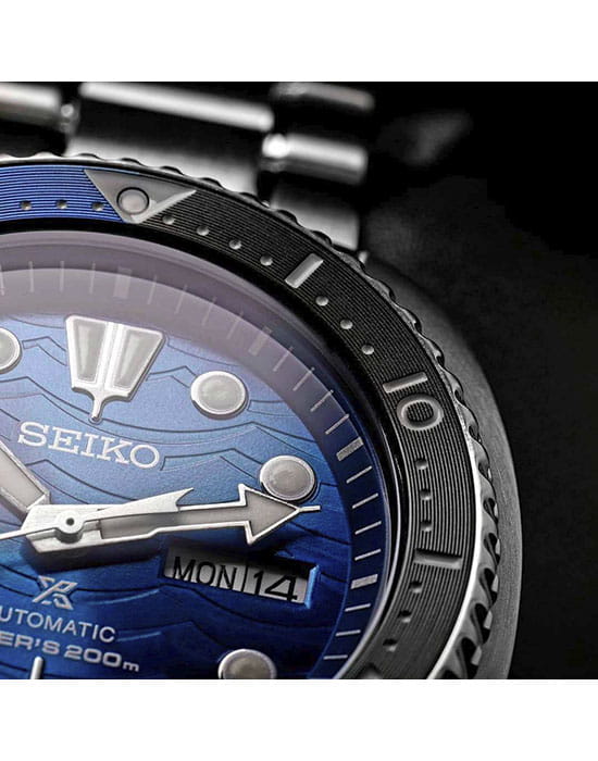 Мужские японские механические часы Seiko SRPD21K1S из коллекции Prospex выполнены в спортивном стиле, циферблат украшен оригинальным рисунком волн.