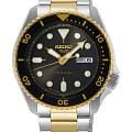 Часы Seiko 5 Sports SRPK22 сочетают в себе элегантный дизайн и надёжность, характерные для японского часового мастерства. Корпус диаметром 42,5 мм выполнен из нержавеющей стали с двухцветным PVD-покрытиемPVDУльтратонкое покрытие наносится в технике вакуумного напыления, сочетает в себе нитрид титана особой прочности со слоем золота или оксида хрома. Несёт в себе декоративную или защитную функцию.: сочетание серебристого и золотистого тонов придаёт часам утончённый вид. Чёрный циферблат защищён минеральным стекломМинеральное стеклоМинеральное стекло представляет собой искусственно выращенный минерал кварца. Такое стекло отличается особой устойчивостью к повреждениям и царапинам. Уступает по некоторым качествам сапфировому стеклу. с повышенной прочностью. ​​