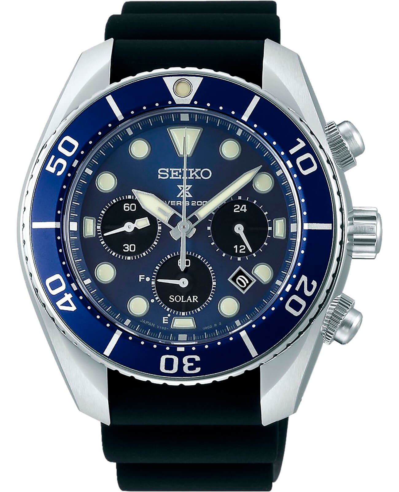 Аксессуар привлекает сдержанным серебристо-синим исполнением в дайверской тематике. Этому способствуют однонаправленно вращающийся безель, заводная головка с защитой, завинчивающаяся задняя крышка, крупная индикация времени. Кварцевый хронографХронографФункция позволяет измерять отрезки времени с особой точностью: часы, минуты, секунды. Верным признаком хронографа является наличие на циферблате 3 дополнительных окошек-счётчиков. получает питание от источников света, реализуется технология . Полностью заряженной батарейки хватит на 6 месяцев работы. Японский механизм Seiko V192 отличается высокой точностью хода. Стрелки и метки дополнены люминесцентной подсветкой LumiBriteЛюминесцентное покрытиеПозволяет считывать показания времени в темноте. Производители наносят на стрелки, часовые индексы, безель или поверхность циферблата светонакопительный состав, дающий холодное свечение..Сапфировое стекло не допускает образования царапин. Часы оснащены секундомером, календарём, индикатором EOLEOLПредставляет собой систему, уведомляющую владельца часов о необходимости замены элемента питания. За 2 недели до полного разряда батарейки секундная стрелка перестаёт ходить чётко и начинает перепрыгивать на 3-4 деления.. Гибкий ремешок сделан из силикона. Диаметр корпуса: 44,5 мм.