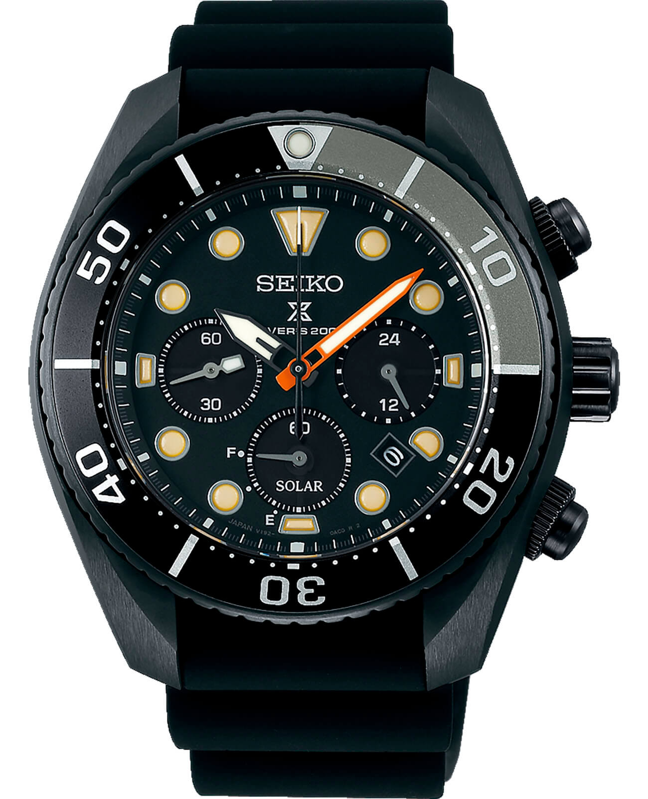 Аксессуар привлекает сдержанным тёмным исполнением в дайверской тематике. Этому способствуют однонаправленно вращающийся безель, заводная головка с защитой, завинчивающаяся задняя крышка, крупная индикация времени. Кварцевый хронографХронографФункция позволяет измерять отрезки времени с особой точностью: часы, минуты, секунды. Верным признаком хронографа является наличие на циферблате 3 дополнительных окошек-счётчиков. получает питание от источников света, реализуется технология . Полностью заряженной батарейки хватит на 6 месяцев работы. Японский механизм Seiko V192 отличается высокой точностью хода. Стрелки и метки дополнены люминесцентной подсветкой LumiBriteЛюминесцентное покрытиеПозволяет считывать показания времени в темноте. Производители наносят на стрелки, часовые индексы, безель или поверхность циферблата светонакопительный состав, дающий холодное свечение..Сапфировое стекло не допускает образования царапин. Часы оснащены секундомером, календарём, индикатором EOLEOLПредставляет собой систему, уведомляющую владельца часов о необходимости замены элемента питания. За 2 недели до полного разряда батарейки секундная стрелка перестаёт ходить чётко и начинает перепрыгивать на 3-4 деления.. Гибкий ремешок сделан из силикона. Диаметр корпуса: 44,5 мм.
