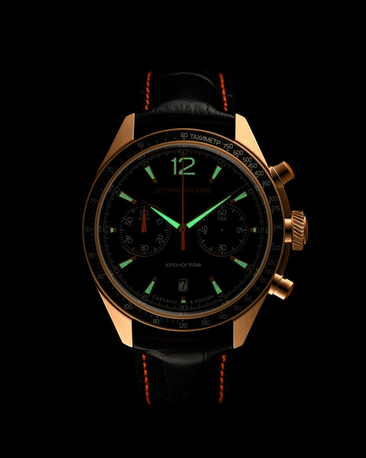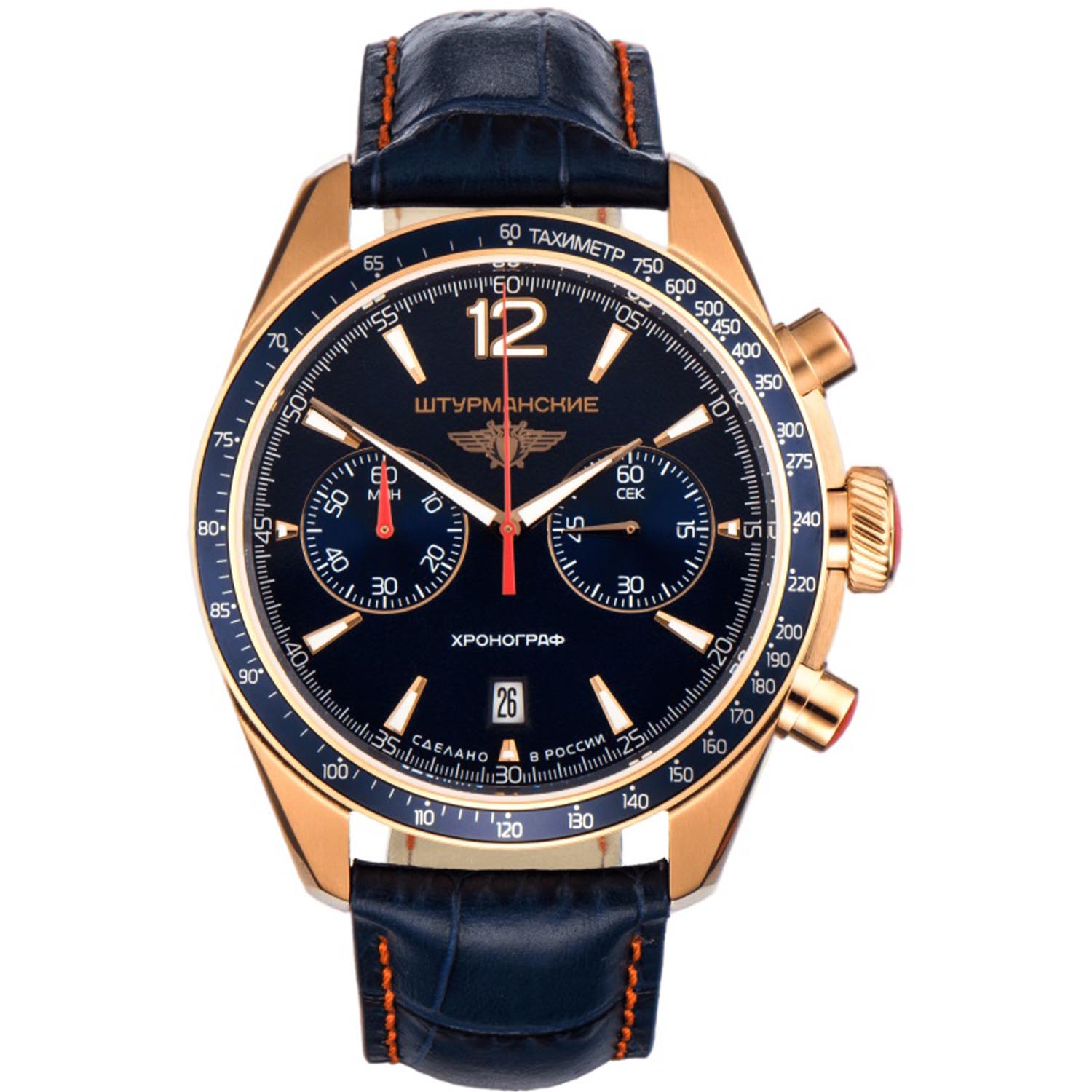 Мужские российские кварцевые часы-хронографХронографФункция позволяет измерять отрезки времени с особой точностью: часы, минуты, секунды. Верным признаком хронографа является наличие на циферблате 3 дополнительных окошек-счётчиков. с секундомеромСекундомерСекундоме́р — прибор, способный измерять интервалы времени с точностью до долей секунды. Штурманские 6S21/4799416, кварцевый механизм с высокой точностью. Класс водозащиты: 50 метров, позволит защитить корпус от случайных брызг или капель дождя. Корпус часов изготовлен из стали с PVD-покрытиемPVDУльтратонкое покрытие наносится в технике вакуумного напыления, сочетает в себе нитрид титана особой прочности со слоем золота или оксида хрома. Несёт в себе декоративную или защитную функцию.. ТахиметрТахиметрРазмеченная шкала, располагается на ободке или безеле часов. Тахиметр позволяет рассчитать скорость на определённом участке пути, расстояние измеряется в километрах или милях.. Кожаный ремешок на стандартной застёжке. Минеральное стеклоМинеральное стеклоМинеральное стекло представляет собой искусственно выращенный минерал кварца. Такое стекло отличается особой устойчивостью к повреждениям и царапинам. Уступает по некоторым качествам сапфировому стеклу. устойчивое к мелким механическим повреждениям. Стрелки и метки с люминесцентным покрытиемЛюминесцентное покрытиеПозволяет считывать показания времени в темноте. Производители наносят на стрелки, часовые индексы, безель или поверхность циферблата светонакопительный состав, дающий холодное свечение..